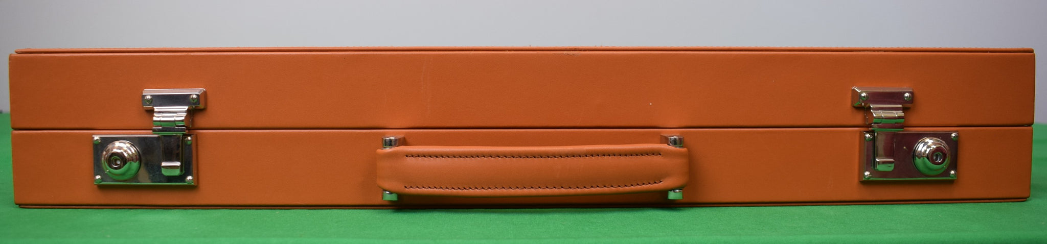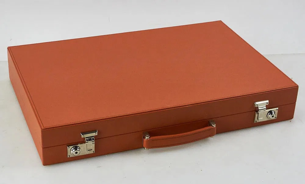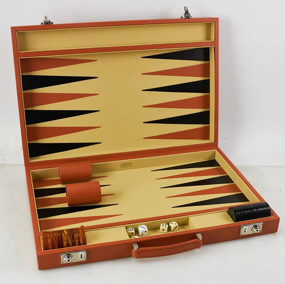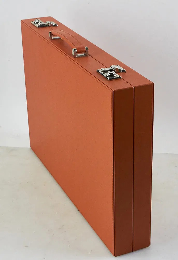 For serious backgammon players looking for something special this is the perfect choice. This backgammon set is made on a hardwood frame covered in the smoothest calf leather. Each set takes several days to produce as it is painstakingly assembled by hand. It closes securely with two solid nickel locks.