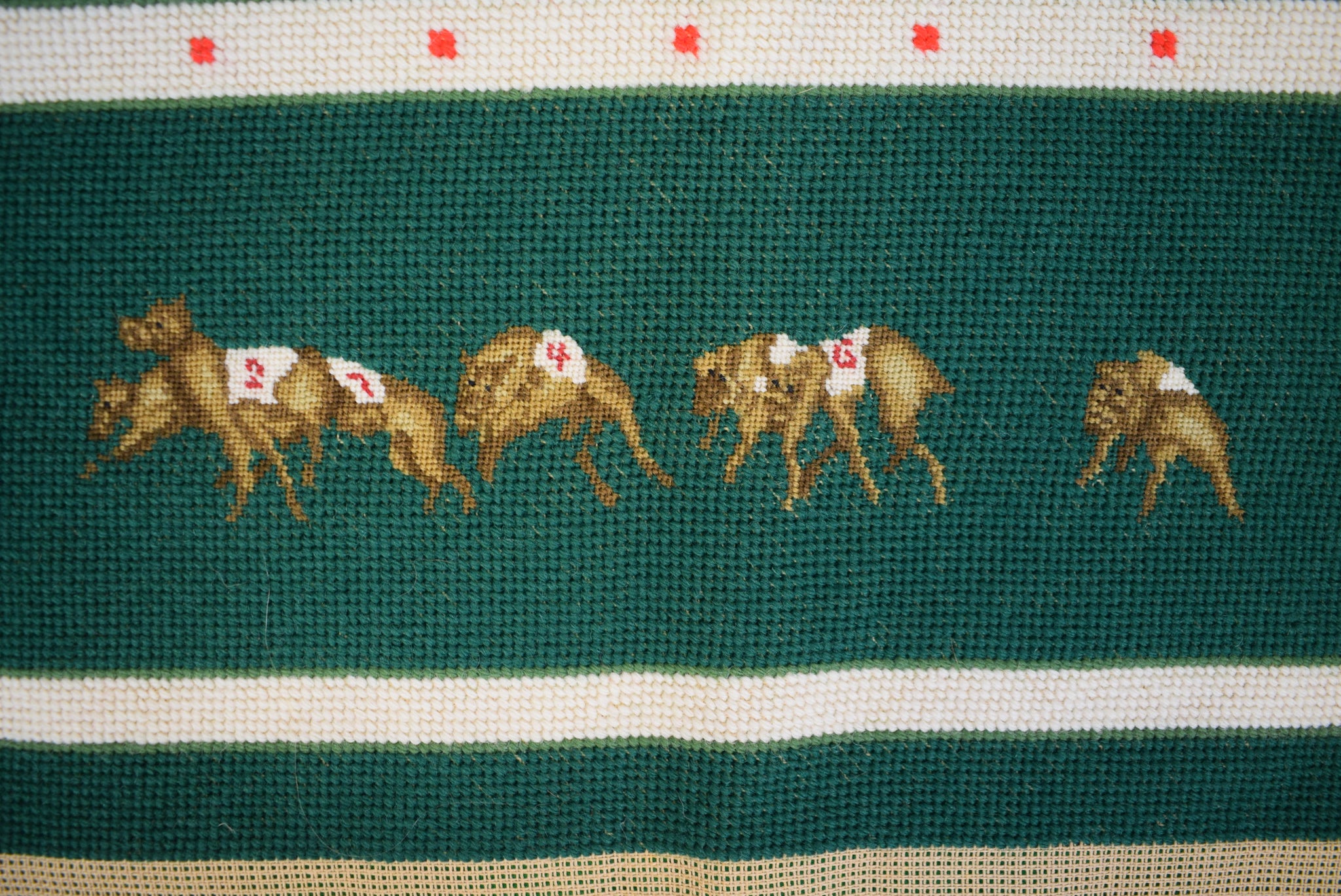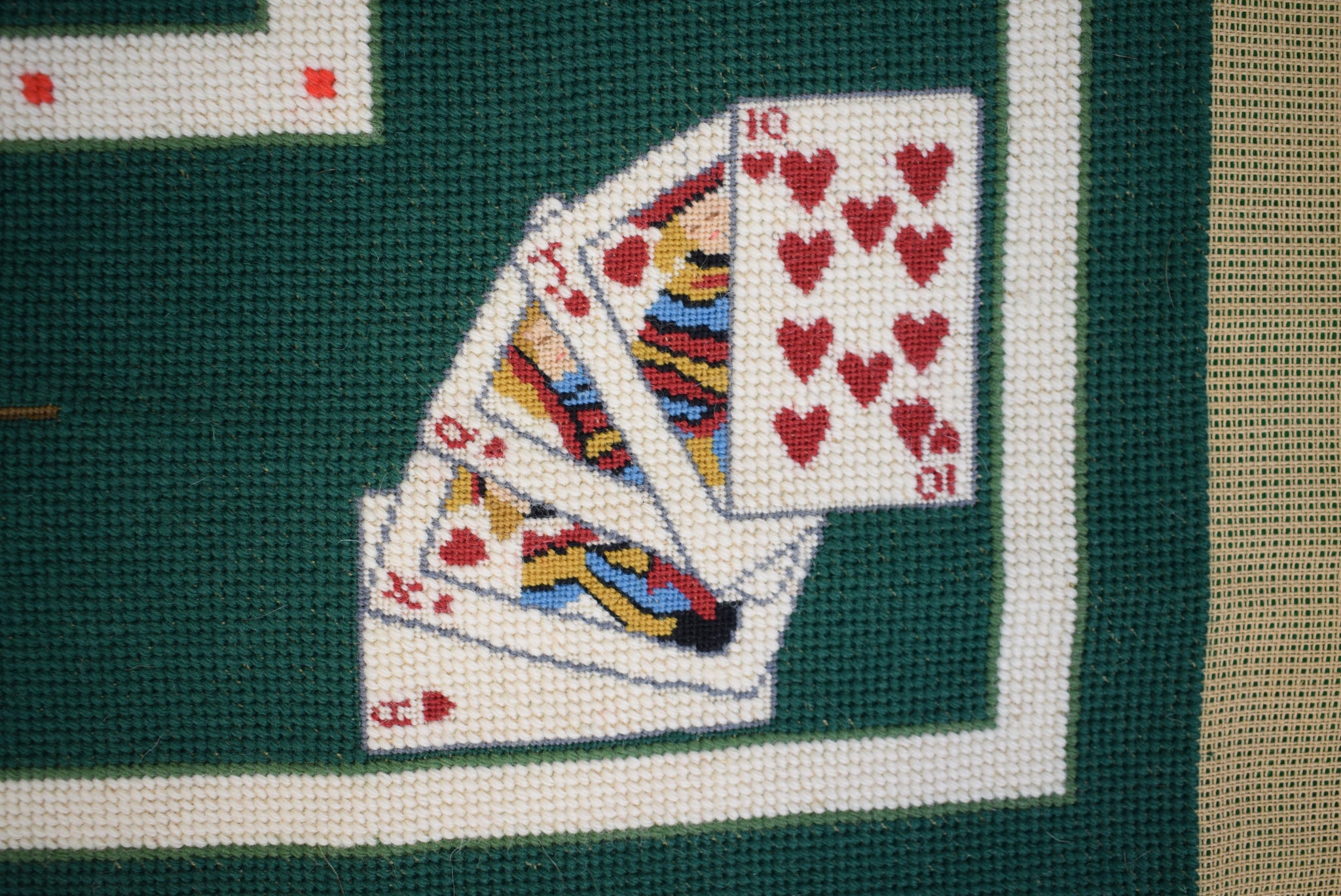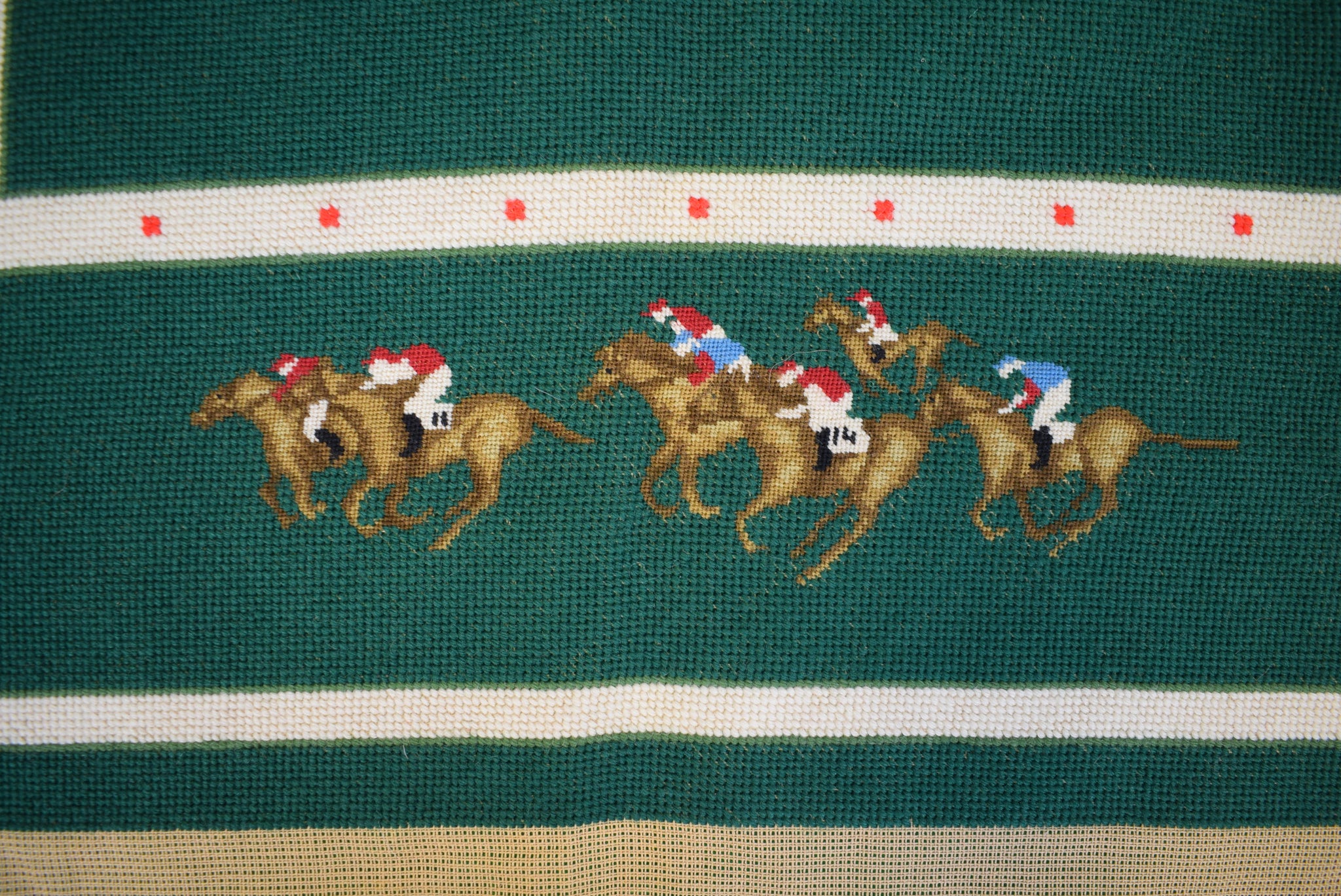 Hand-Needlepoint Bridge Card Table Cover w/ Racehorses & Playing Cards