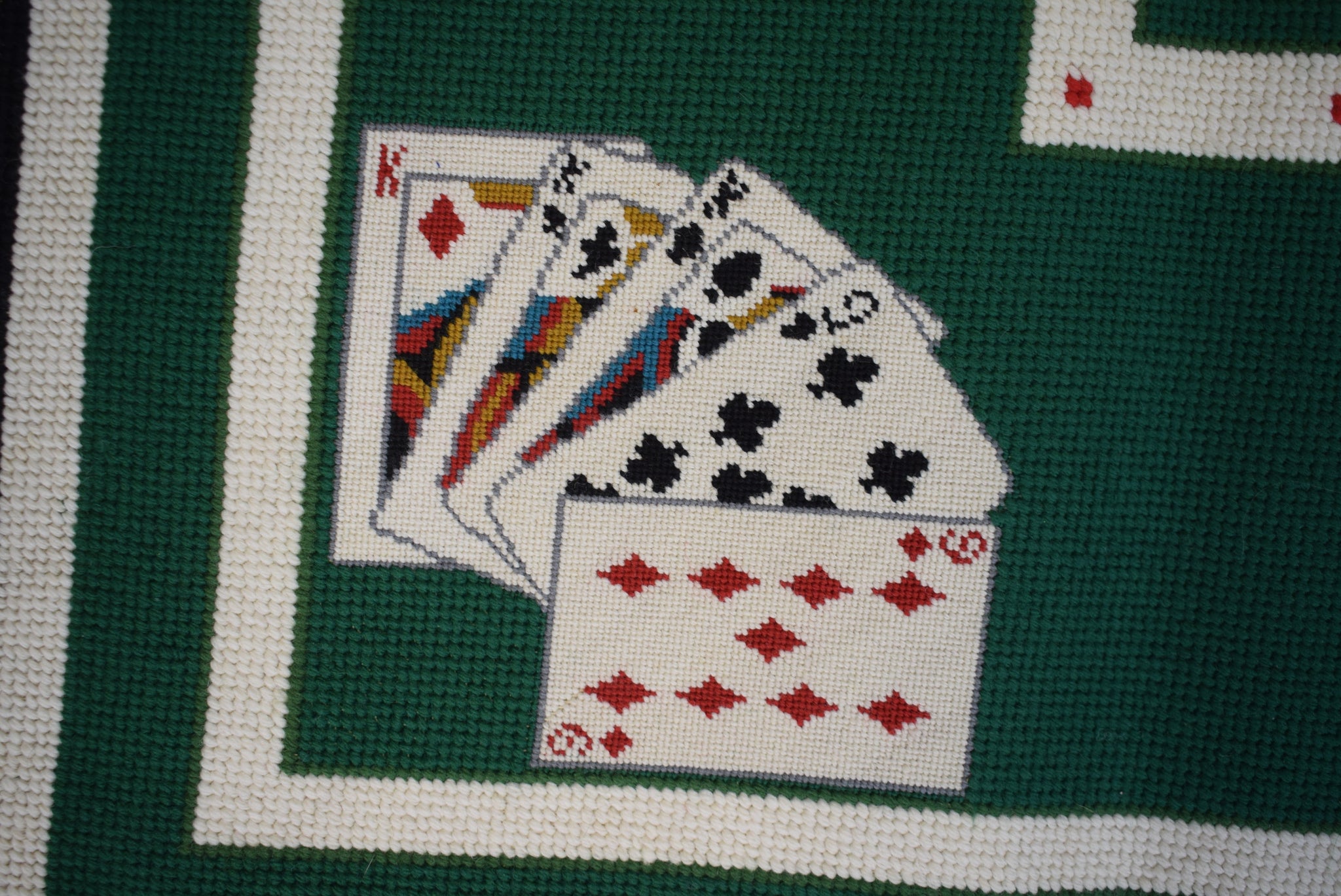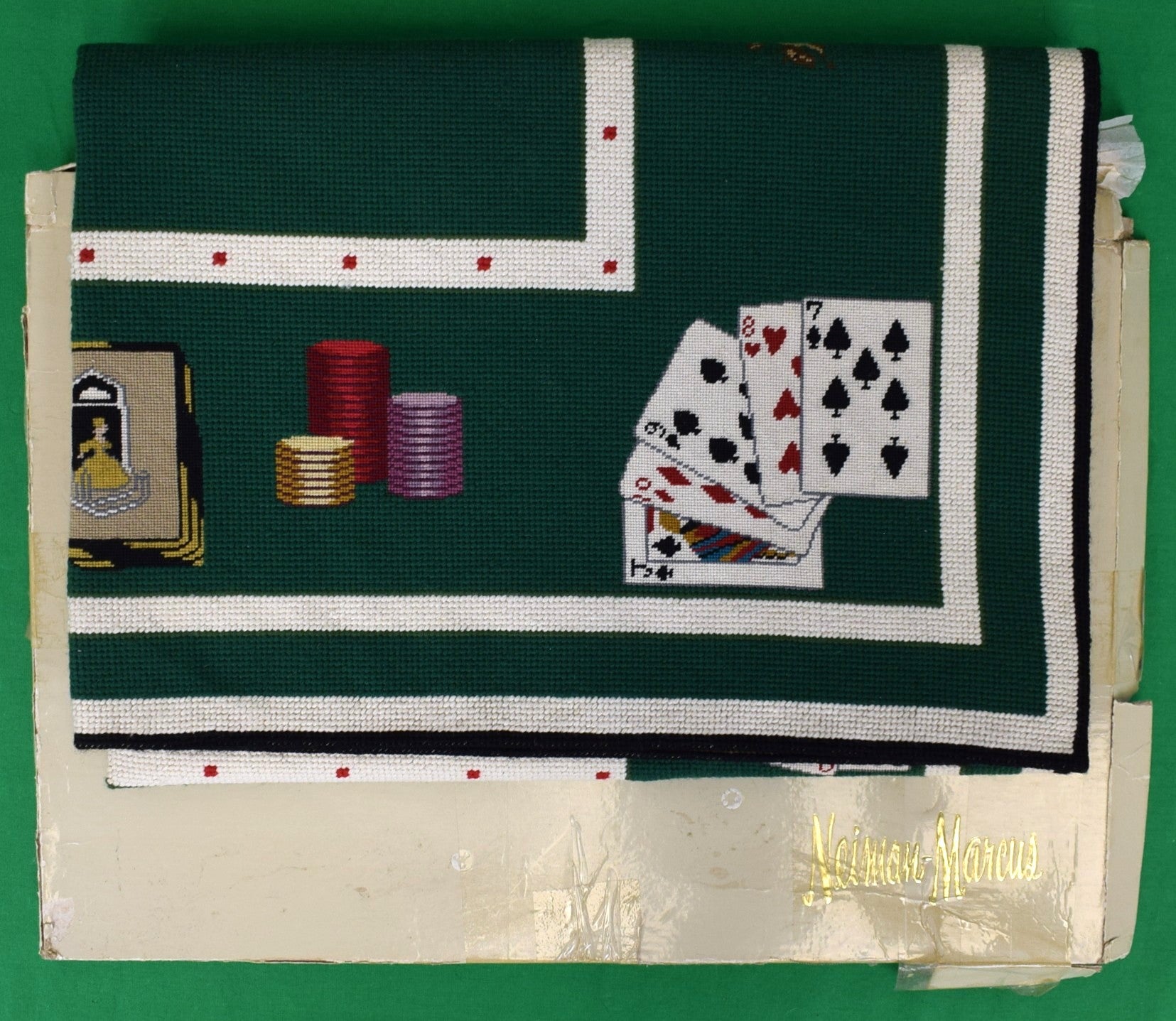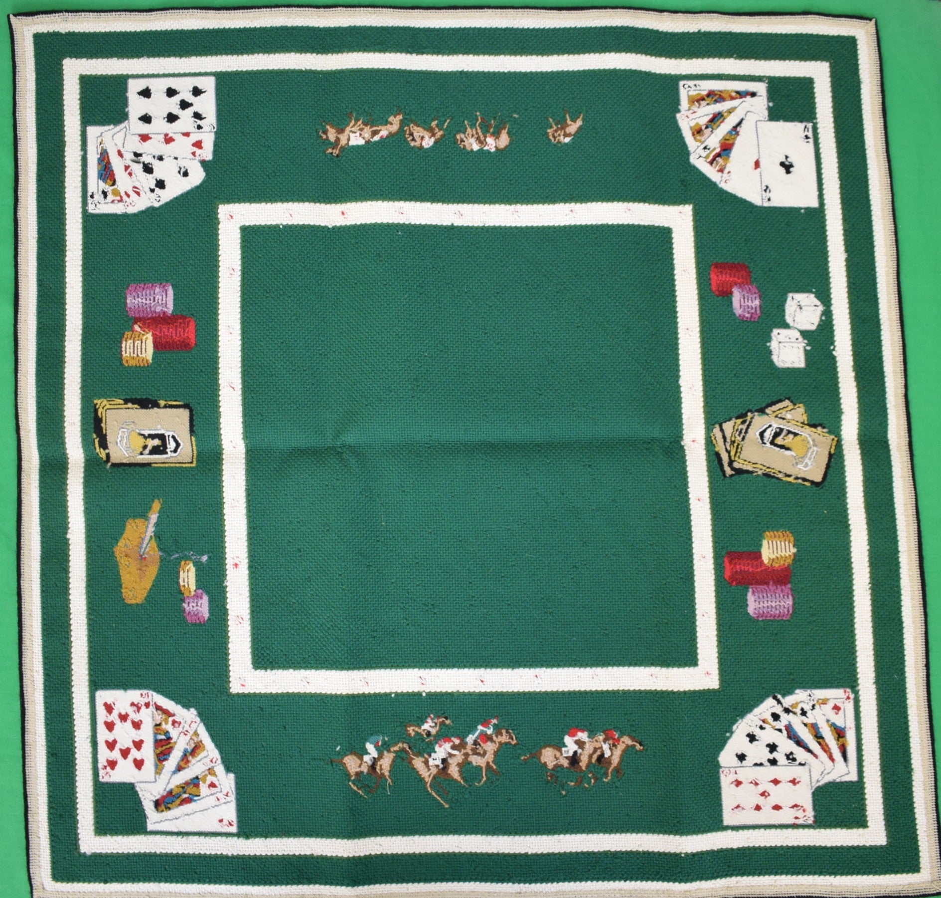 Hand Needlepoint Bridge Table Cover w/ Playing Cards/ Jockeys/ Poker Chips & Greyhound Dogs (New in NM Box)