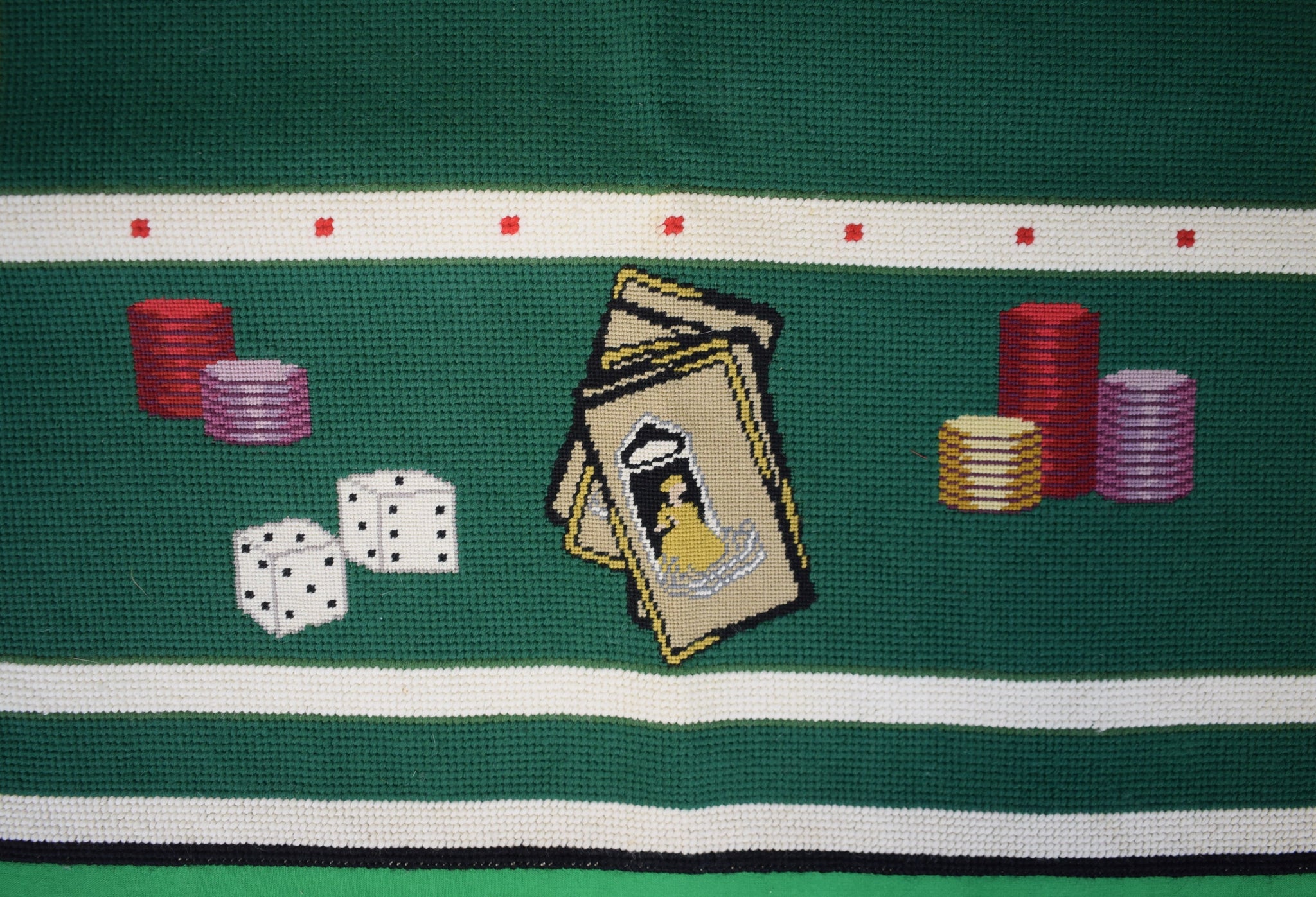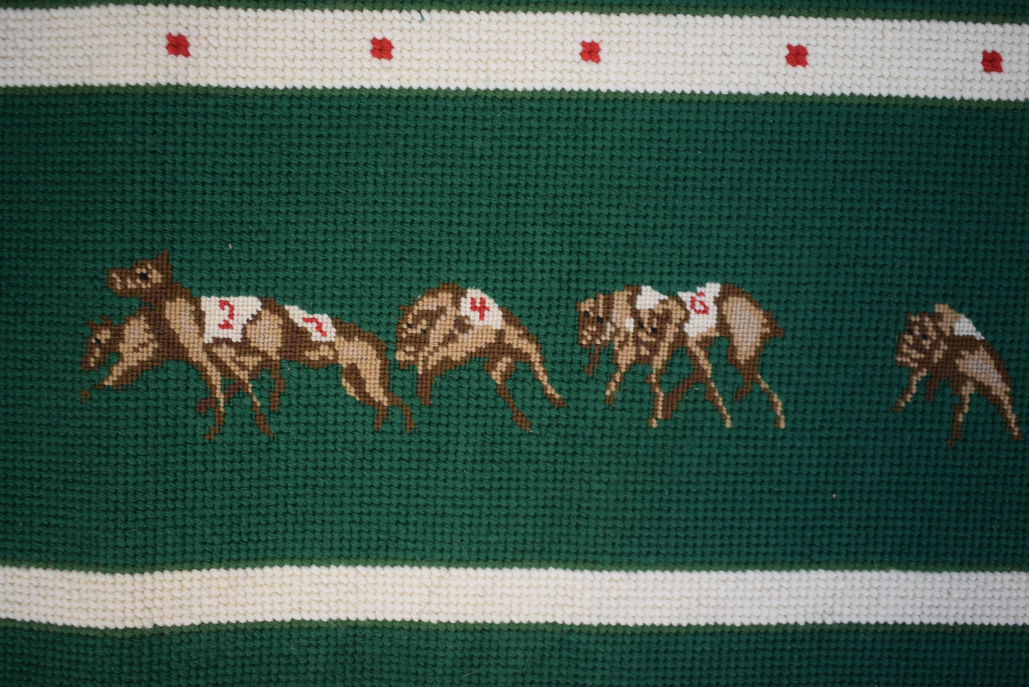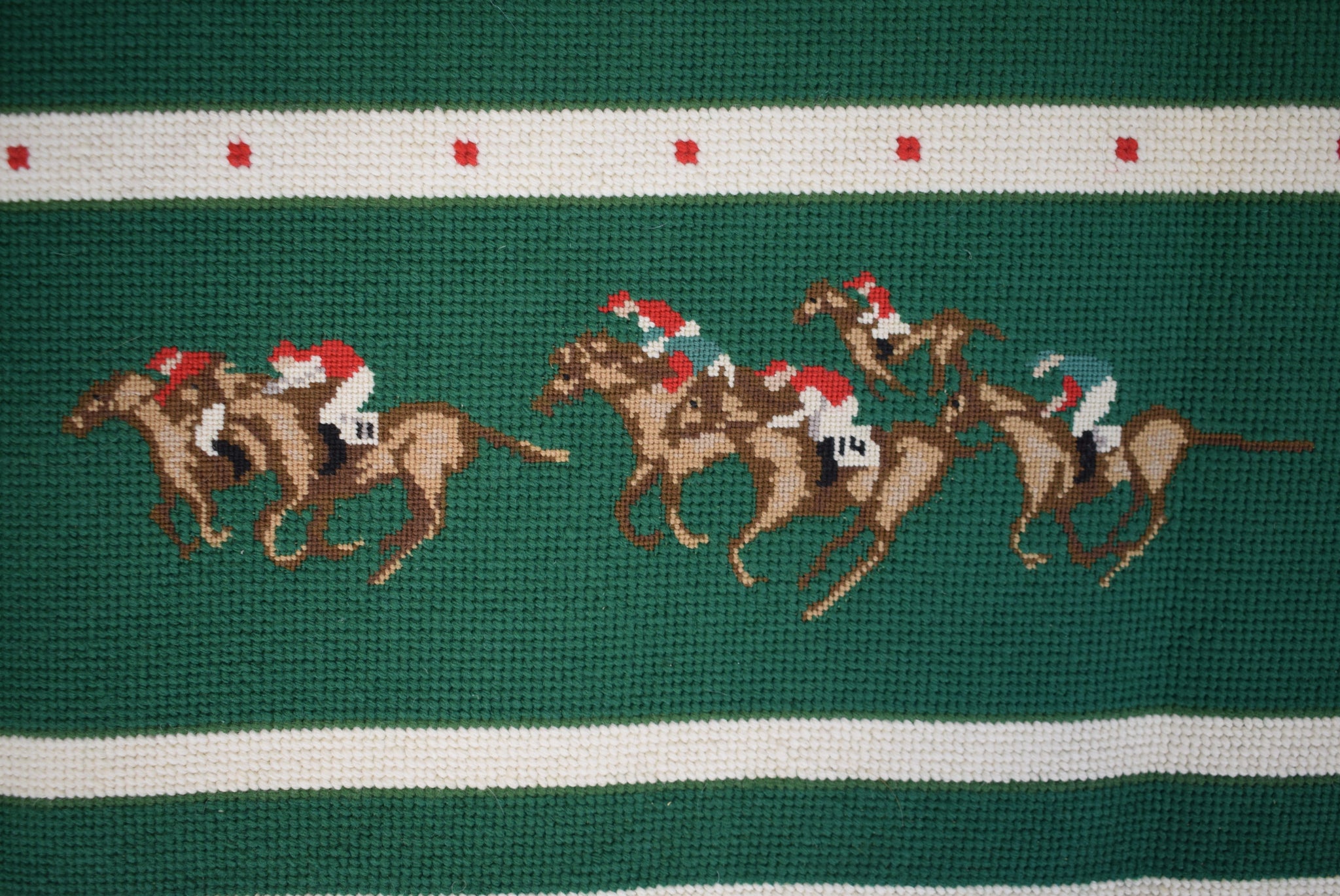 Hand Needlepoint Bridge Table Cover w/ Playing Cards/ Jockeys/ Poker Chips & Greyhound Dogs (New in NM Box)