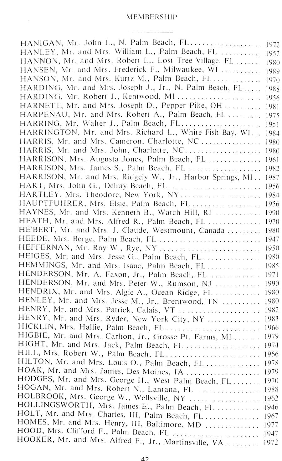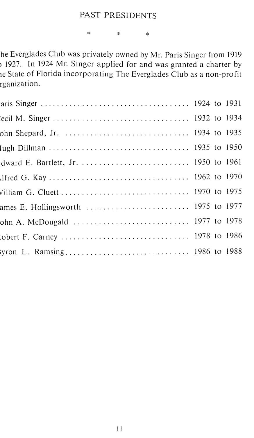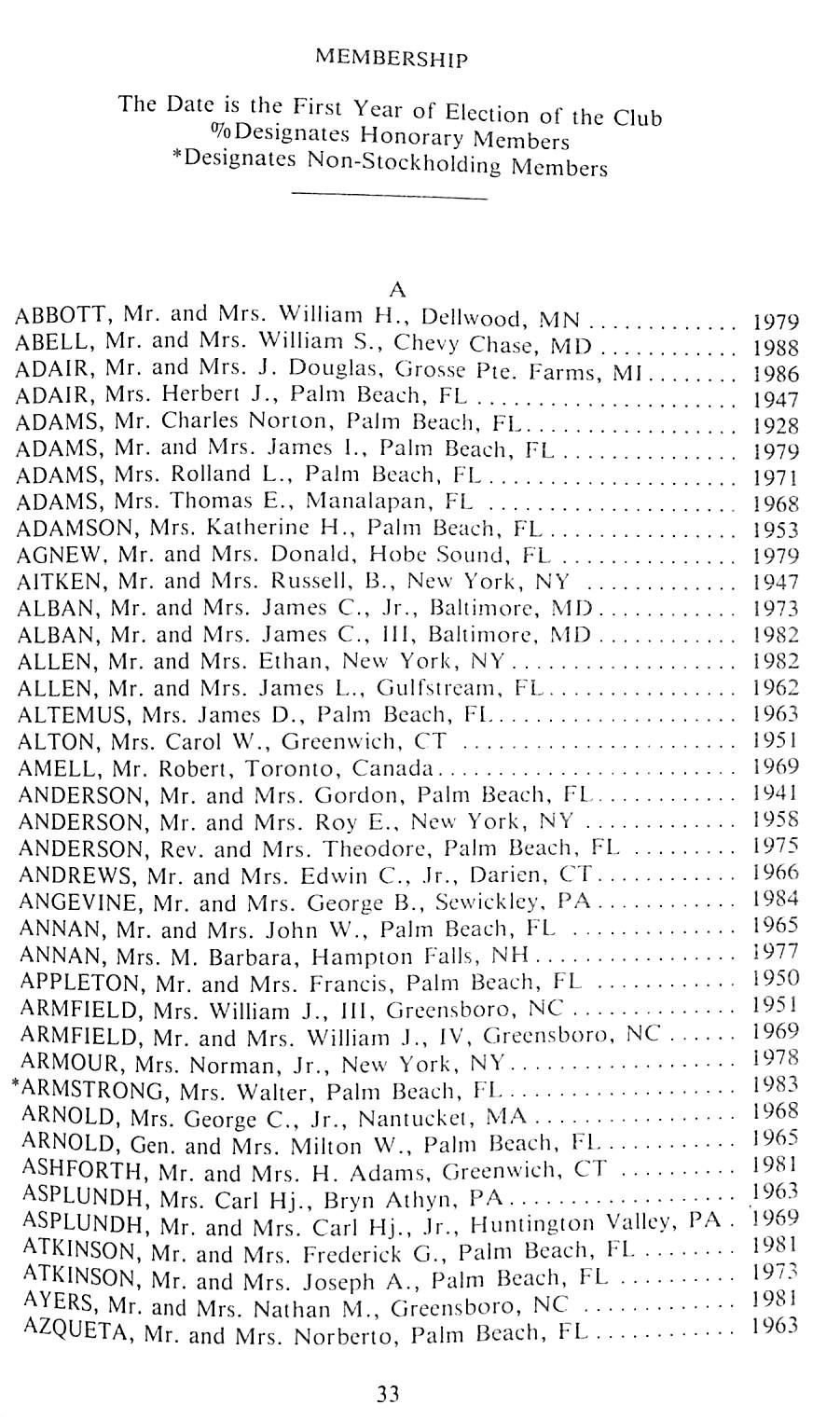 Singer began his club with twenty-five charter members. Two years later, the membership was closed at 500 members. Eliza Osgood Vanderbilt Webb (1860–1936) was one of its earliest female members. Businessman Jack C. Massey was a member.