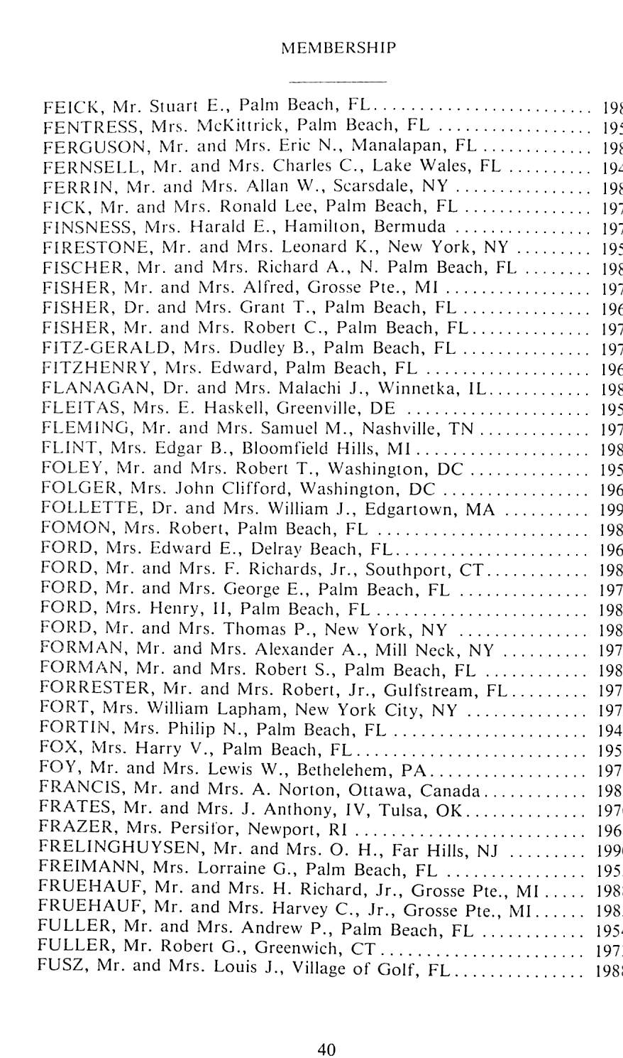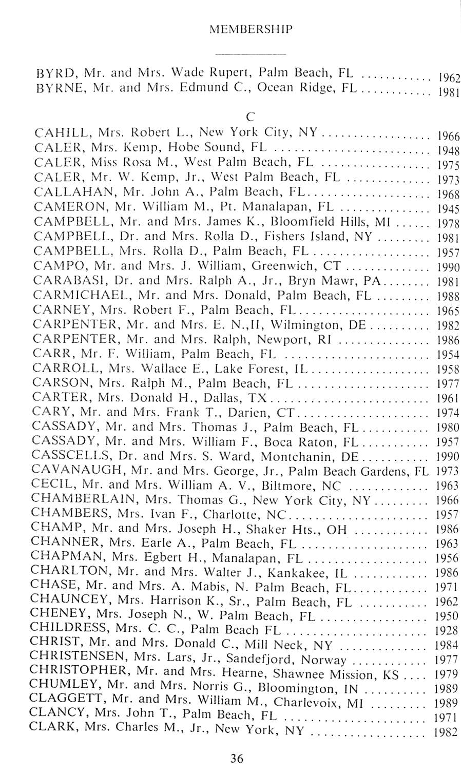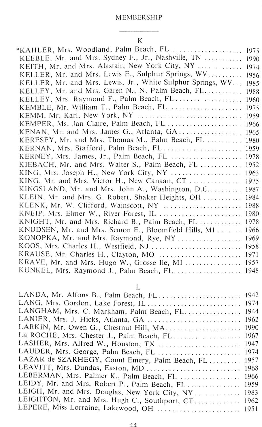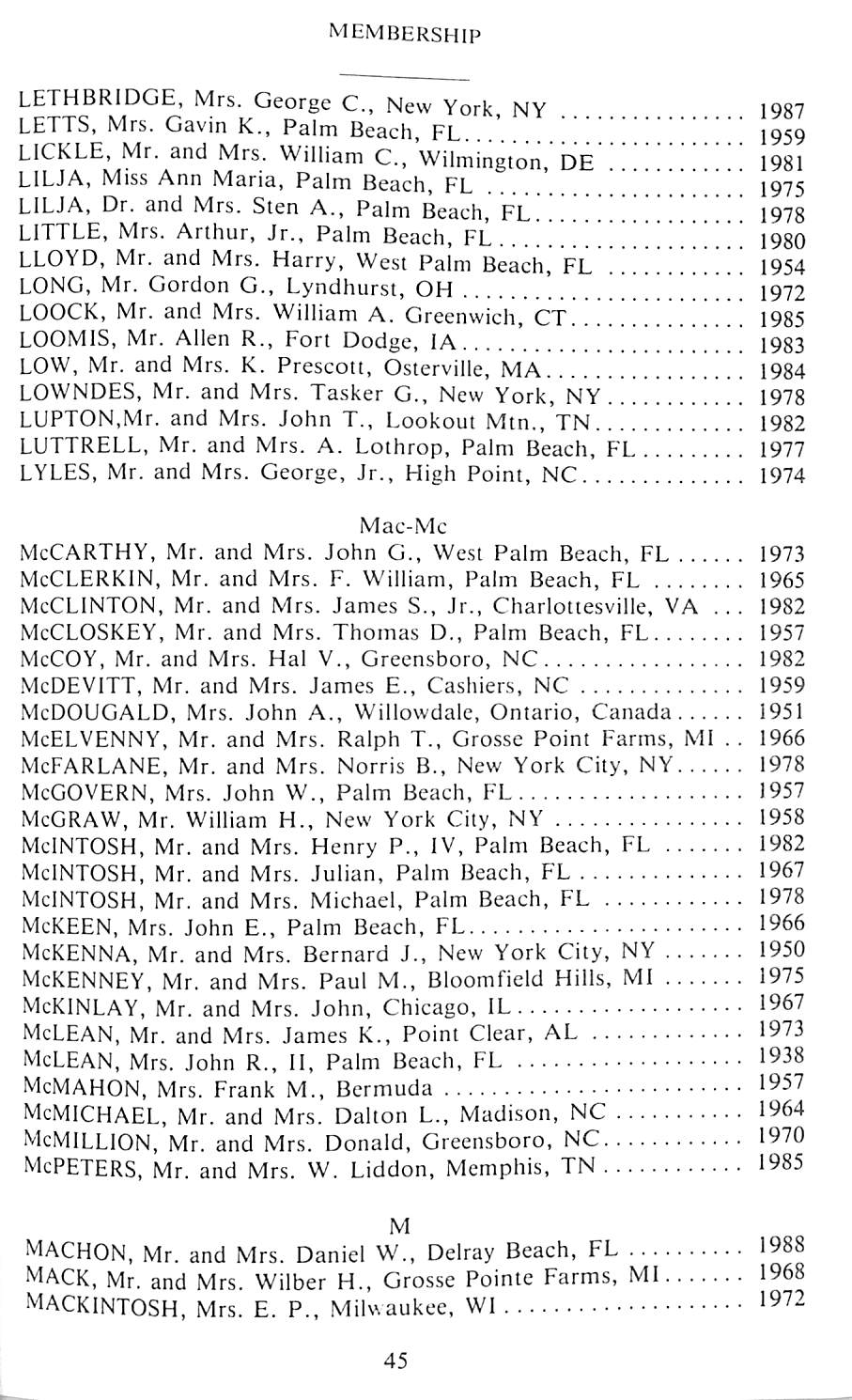 Singer began his club with twenty-five charter members. Two years later, the membership was closed at 500 members. Eliza Osgood Vanderbilt Webb (1860–1936) was one of its earliest female members. Businessman Jack C. Massey was a member.