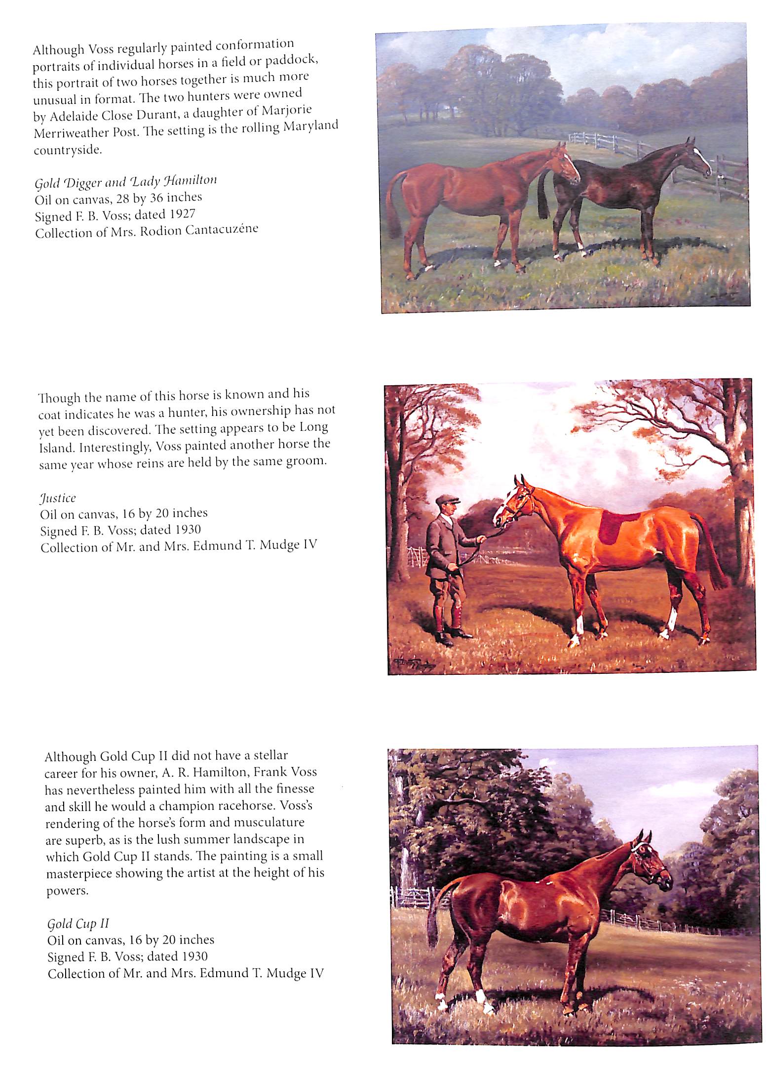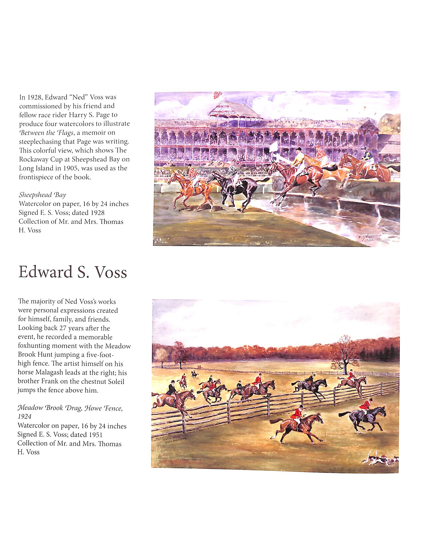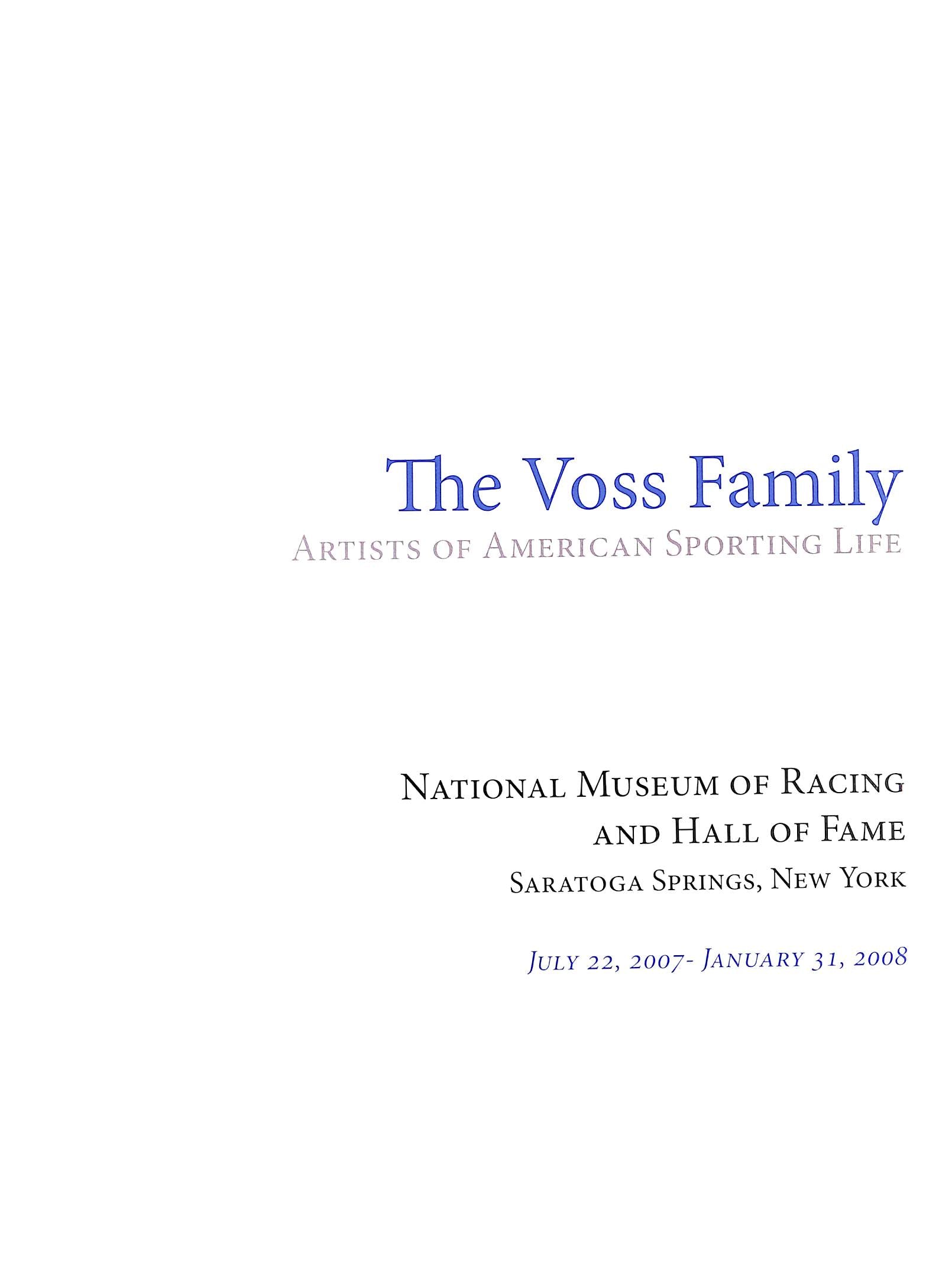 This exhibit features over 85 works of art such as oil paintings, watercolors, pastels, print and sculptures by members of the Voss family. The Voss family were a group of artists who painted American sporting life, including racehorses and hunting horses. The family included Franklin Brooke Voss, Elsa Horne Voss, and Hermann Georg August Voss, an art historian.