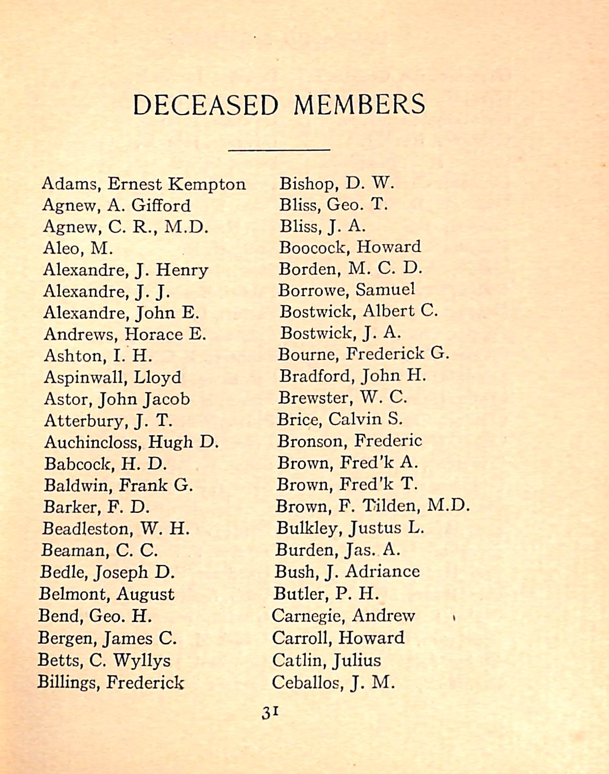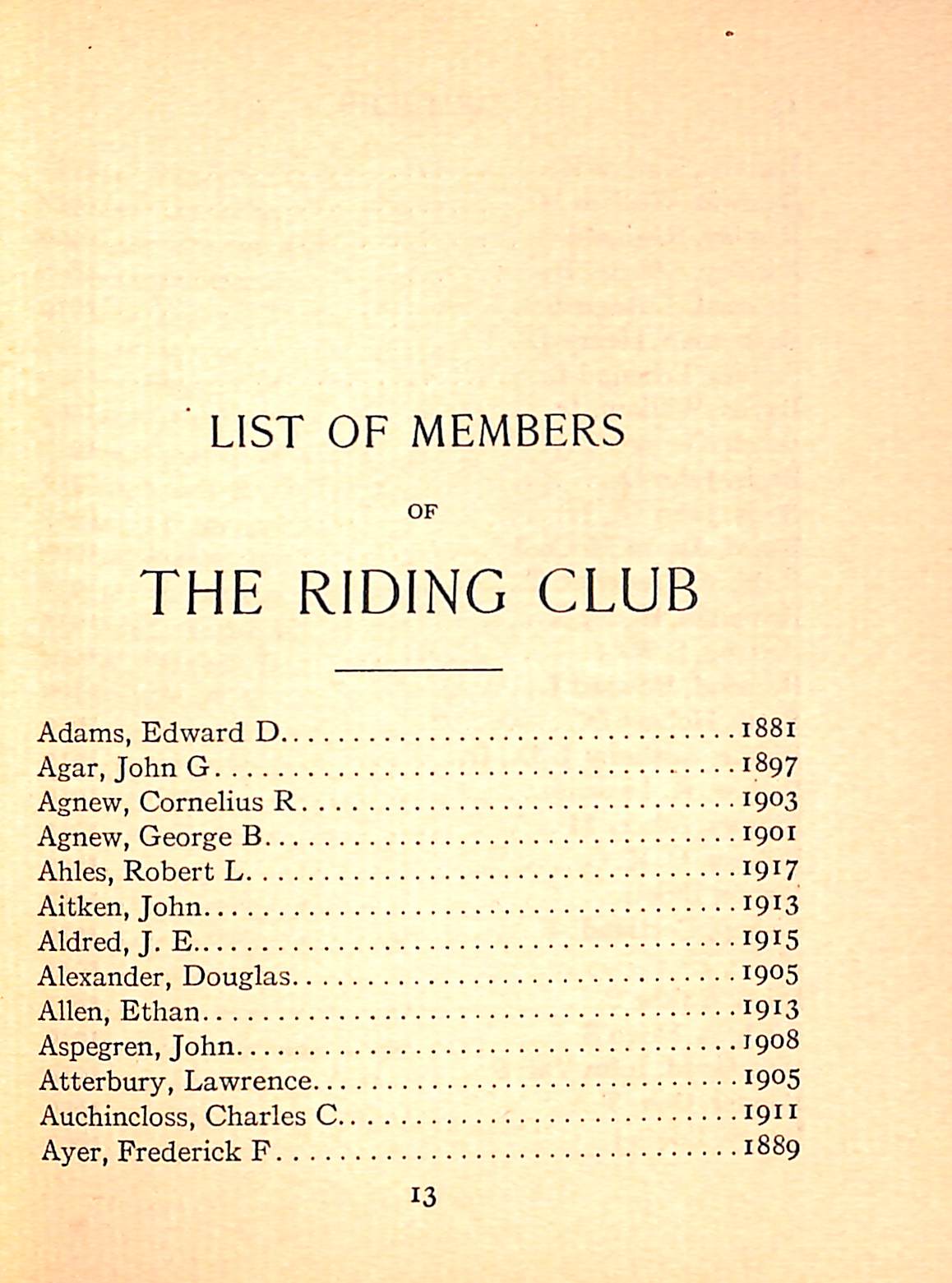 The Riding Club's founders successfully set out to make theirs the most exclusive in the city. Membership was limited to 400, "and election to the club is a very difficult matter," said the magazine. "The club is most particular about the social standing of its members, and also makes a high standard of horsemanship a necessary qualification." Members paid an initiation fee of $200 and an annual dues of $100.