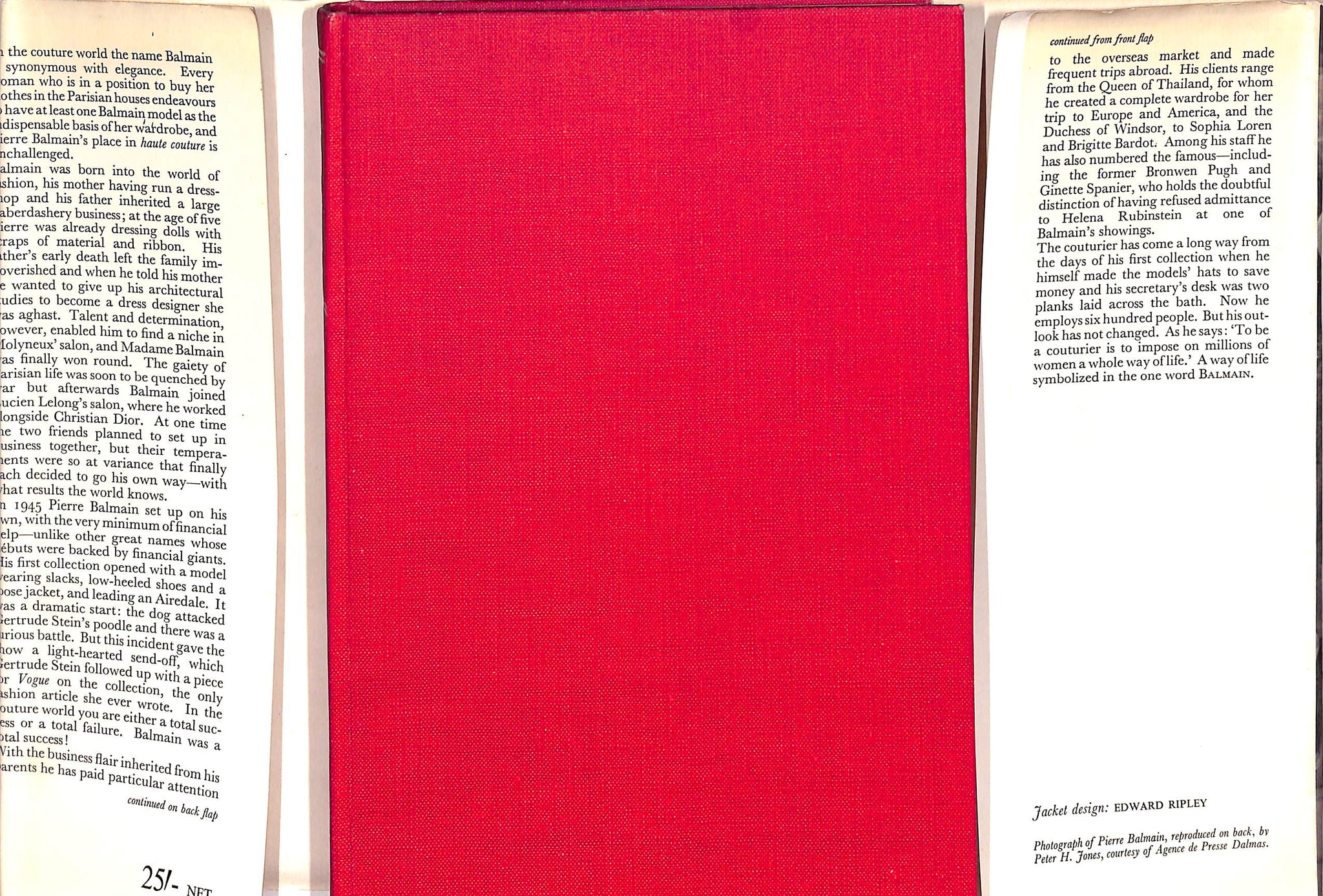 Pierre Balmain. Translated by Edward Lainchbury, with Gordon Young. Cassell. London. 1964. First edition. Signed by Balmain to front free-endpaper - 'With best wishes Pierre Balmain'. Hardback, quarto; red cloth-bound boards, dust jacket. xxii, 40 hors-texte plates with b&w photographs. English
