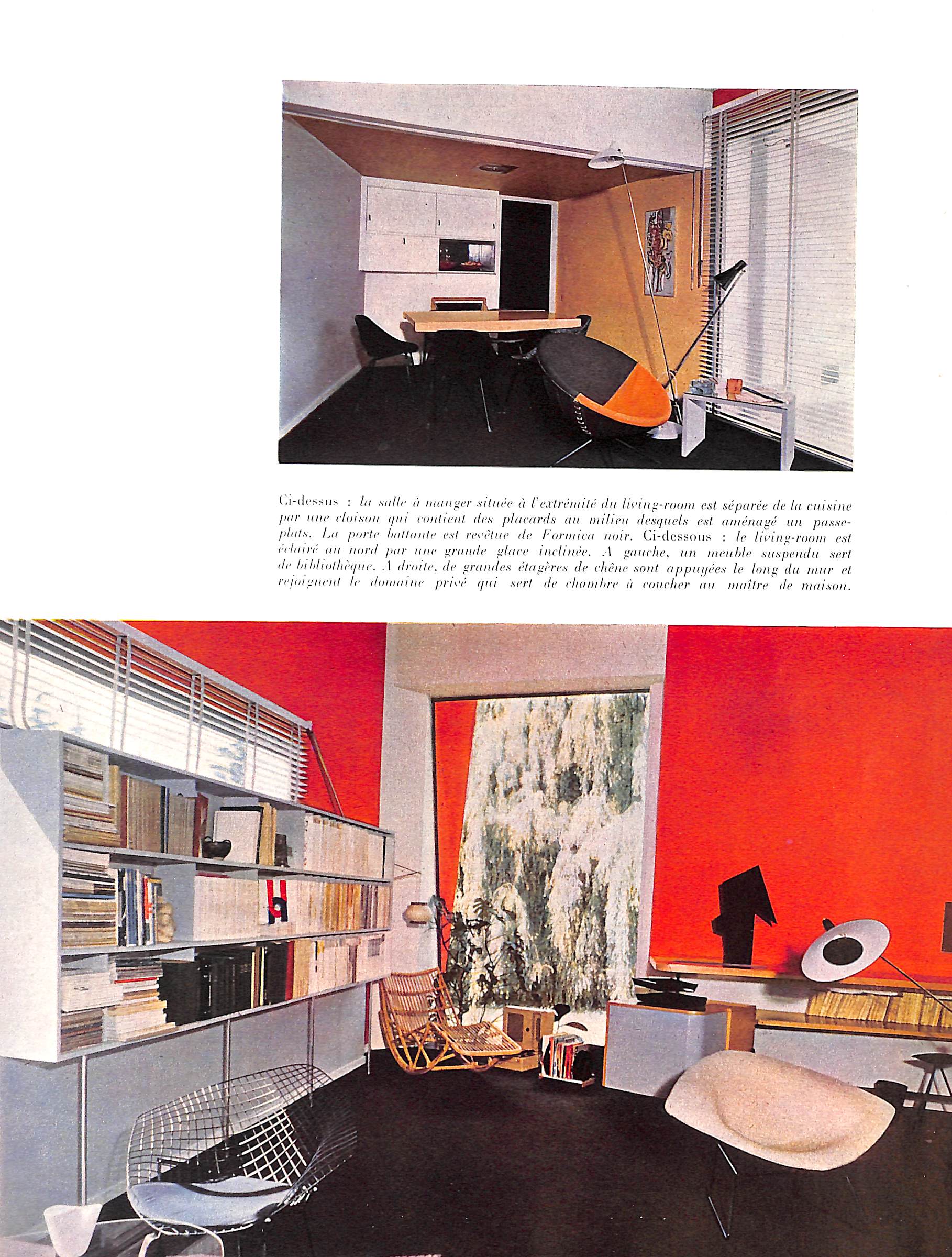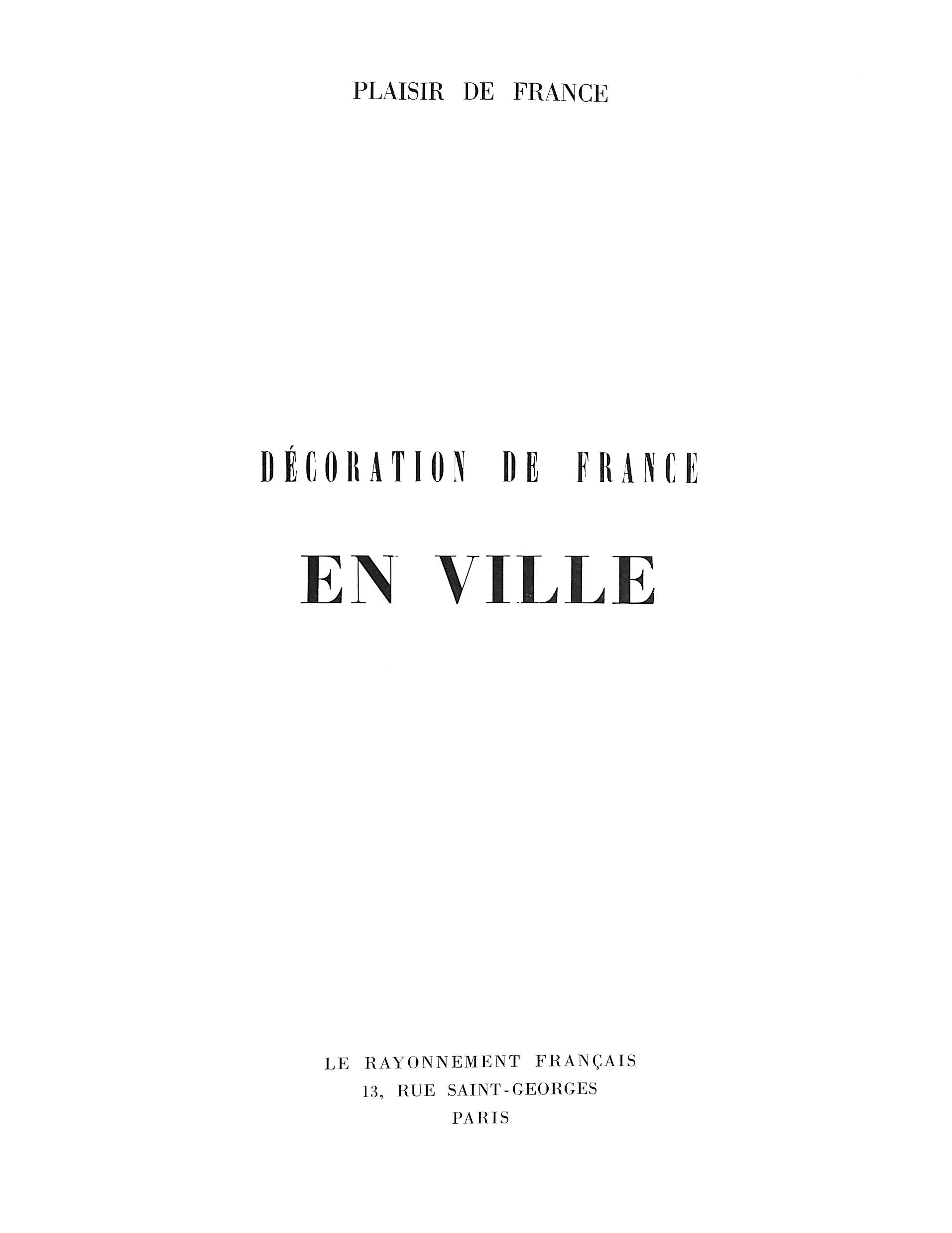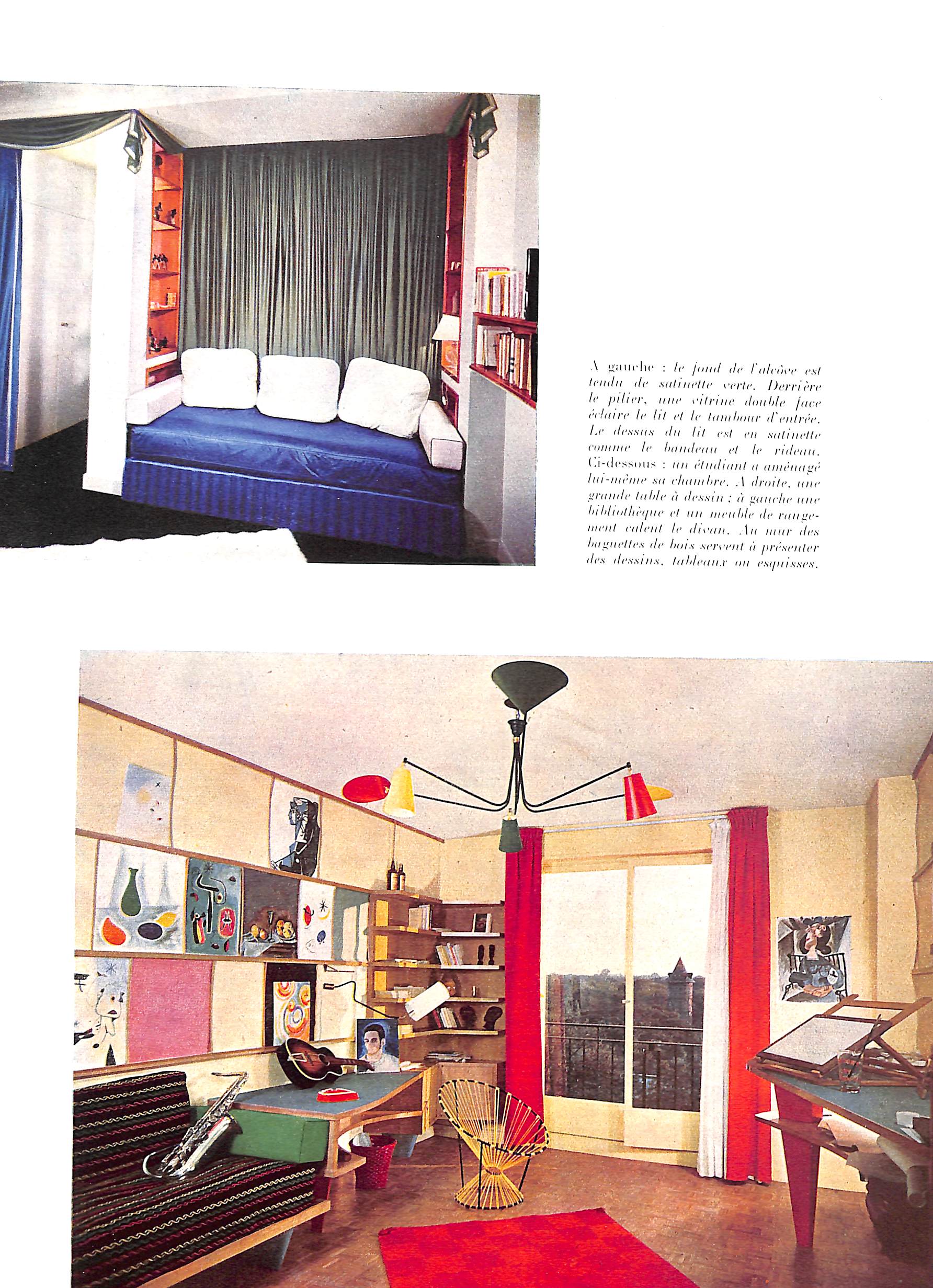 Attractive illustrated cover designed by Jacques Dubois. Jean Leleu contributes a chapter "Le decorateur architecte d'interieur". Architects and designers include Alfred Bernard, Mm. Perron et Griffiths, Le Manach et Hubschwerlin, Jansen, Micheline Curtet, Lionel Mirabaud, Jean-Rene Prou, Fersen, Georges Goldberg, Bleynie, Ginsberg Masse & Ilinski, Jean Ginsberg, Knoll, Jean Royere, Mercier Freres, Yves Courcoux, Jacques Dumont, Raymond Subes, Henri Pottier, Jean Tessier, J. Lecouteur, P. Herbe, Jacques Lenoble, Jean Prouve, Soubriez, Pierre Pinsard, Sarinien, Jean Tessier, Guyon, Andre Bloch, etc