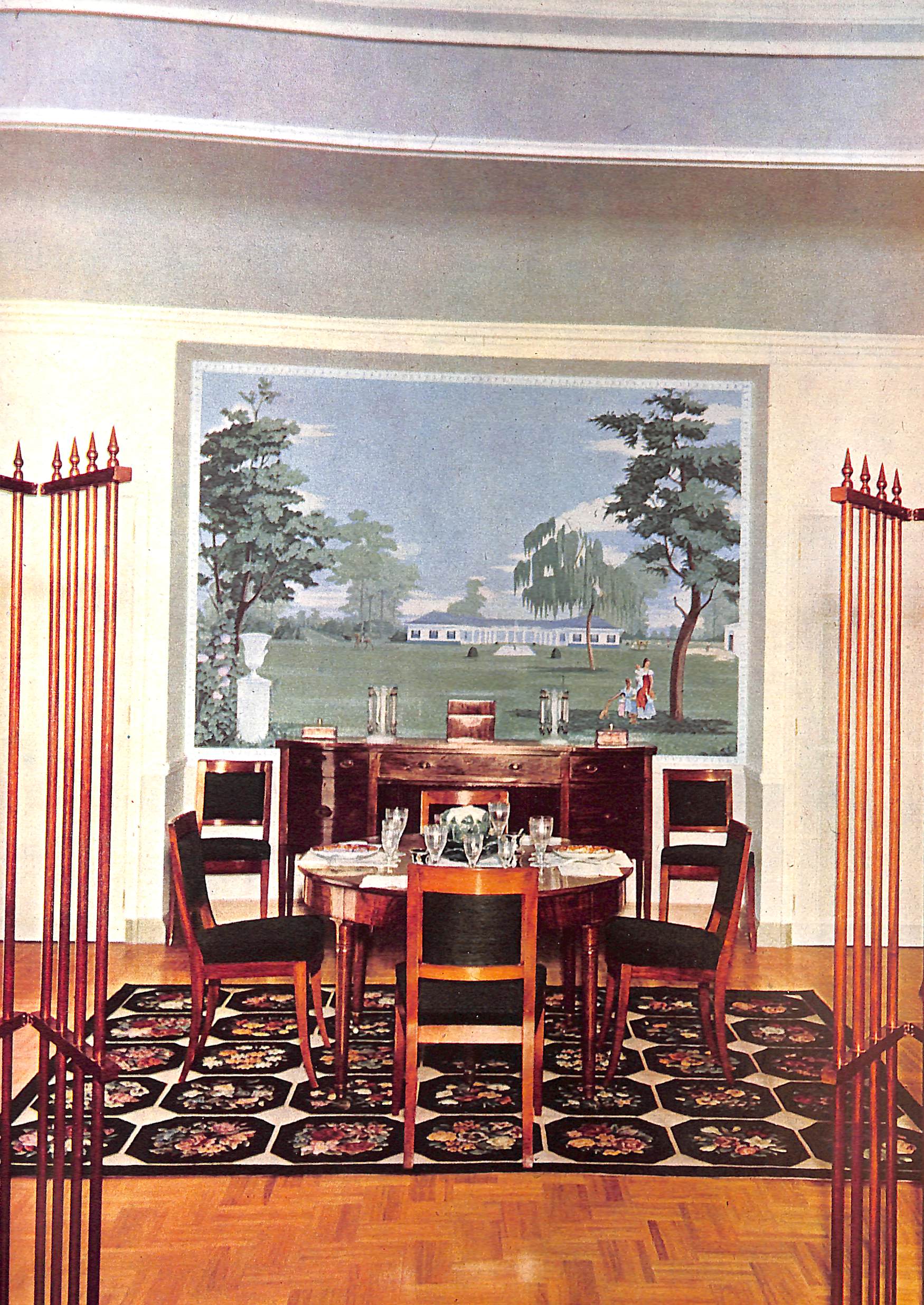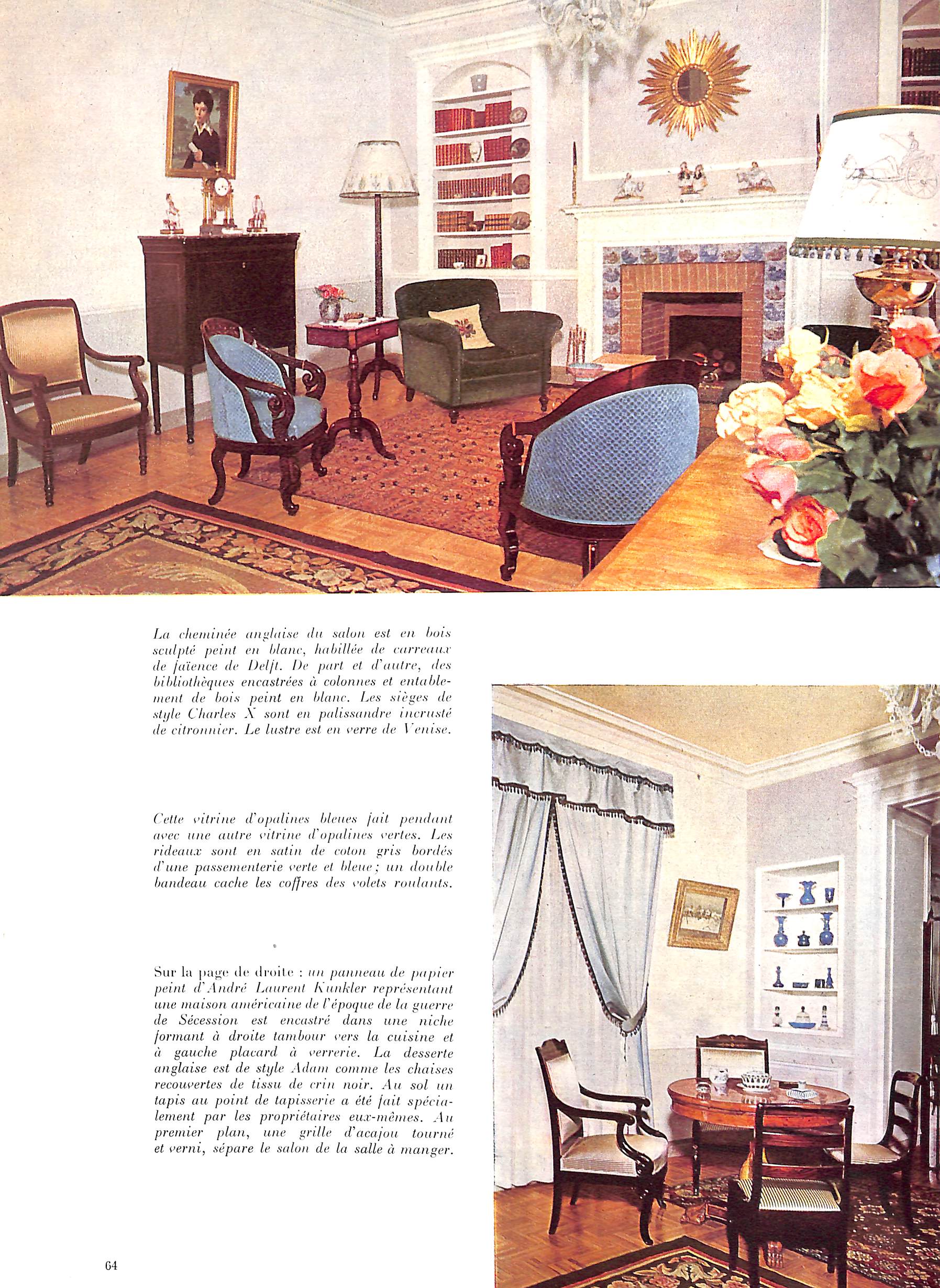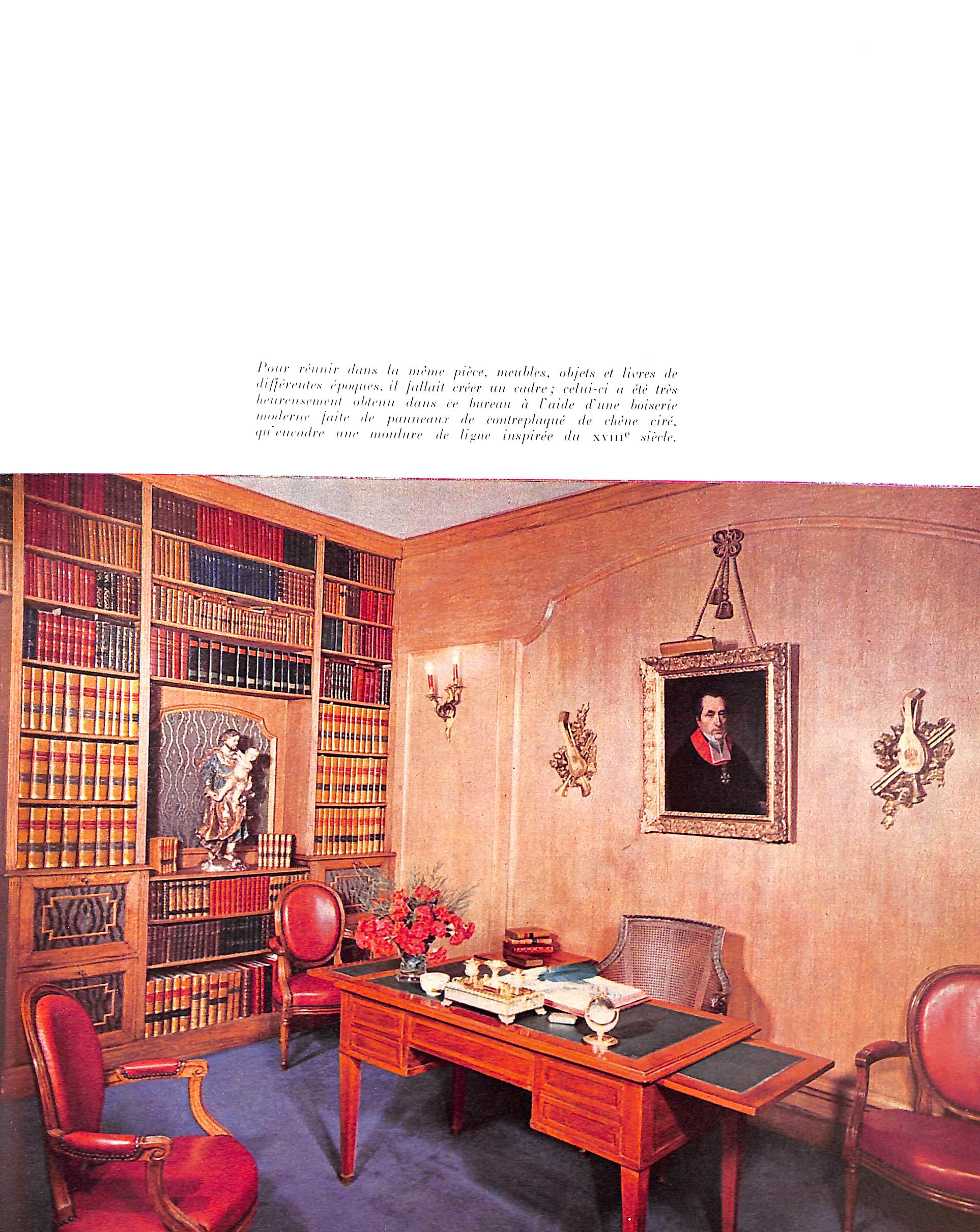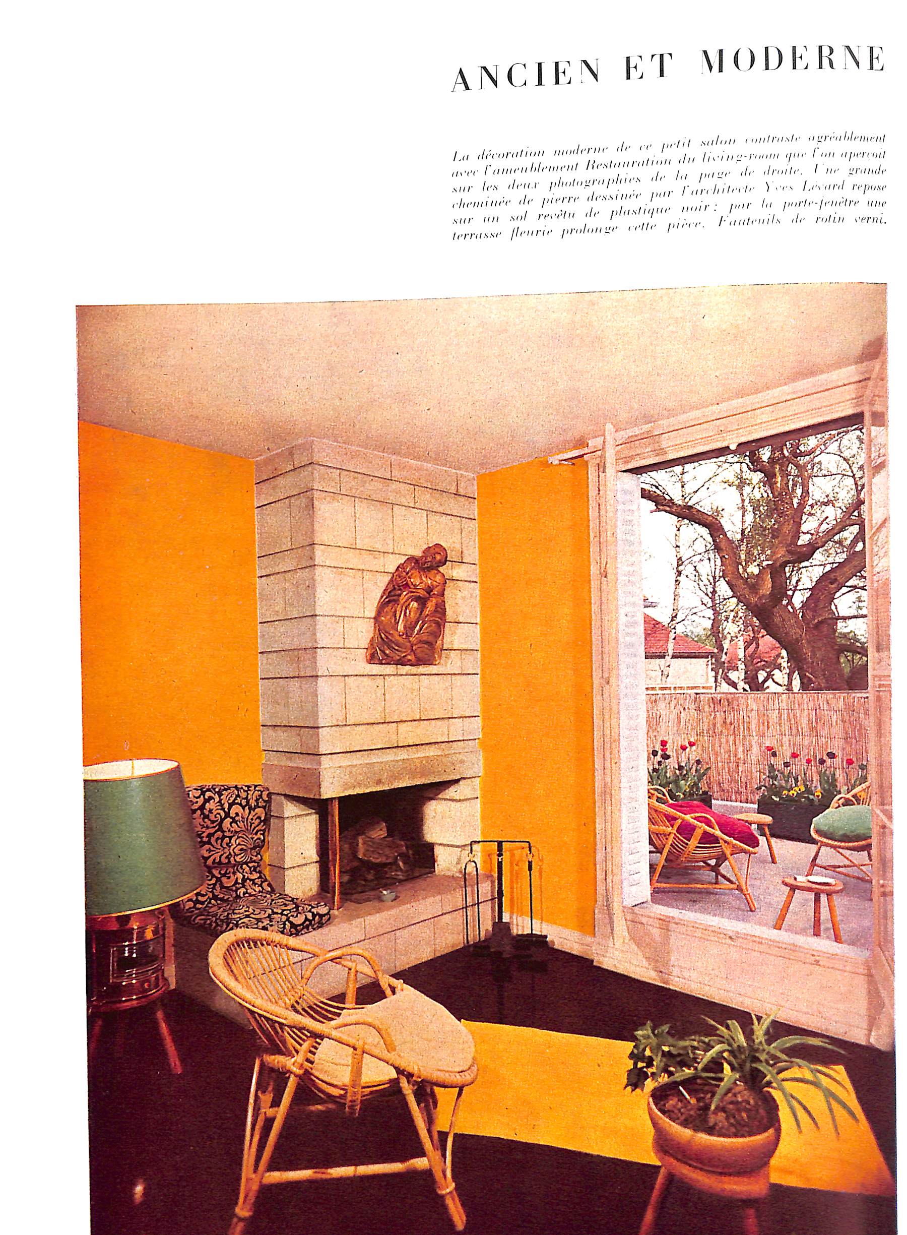 Attractive illustrated cover designed by Jacques Dubois. Jean Leleu contributes a chapter "Le decorateur architecte d'interieur". Architects and designers include Alfred Bernard, Mm. Perron et Griffiths, Le Manach et Hubschwerlin, Jansen, Micheline Curtet, Lionel Mirabaud, Jean-Rene Prou, Fersen, Georges Goldberg, Bleynie, Ginsberg Masse & Ilinski, Jean Ginsberg, Knoll, Jean Royere, Mercier Freres, Yves Courcoux, Jacques Dumont, Raymond Subes, Henri Pottier, Jean Tessier, J. Lecouteur, P. Herbe, Jacques Lenoble, Jean Prouve, Soubriez, Pierre Pinsard, Sarinien, Jean Tessier, Guyon, Andre Bloch, etc