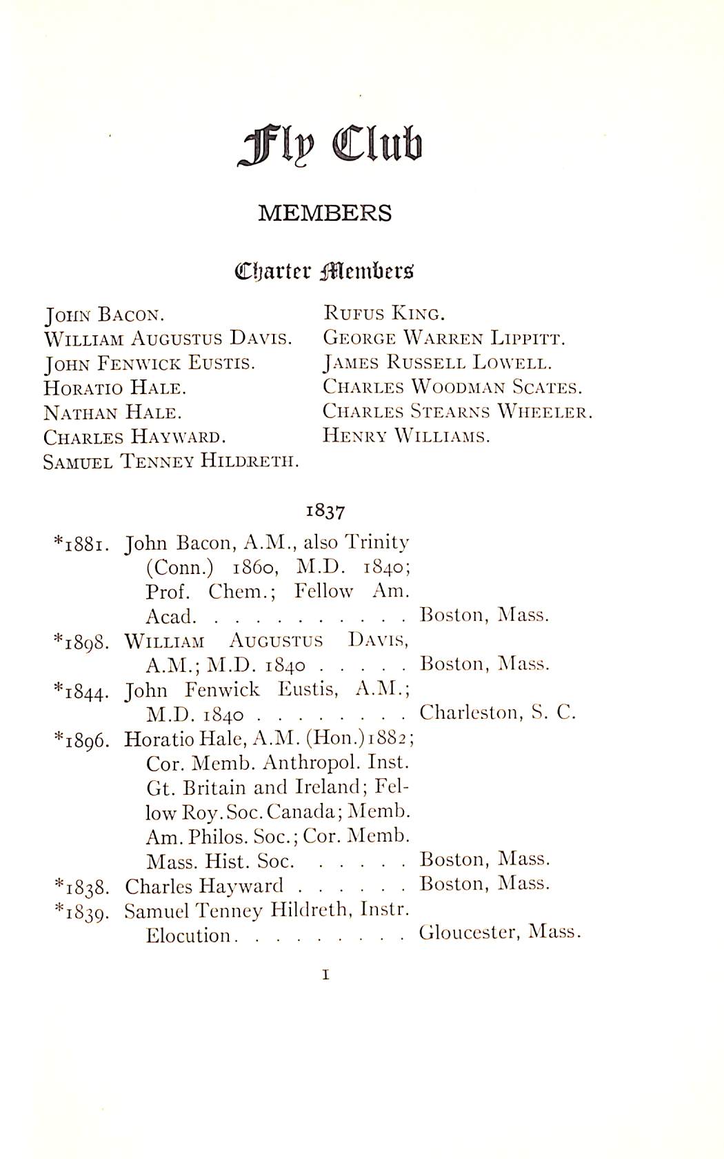 Founded in 1836 as a literary society by the editors of Harvardiana, the club was granted a charter by the Alpha Delta Phi fraternity on March 29, 1837. It remained active until surrendering its charter in 1865. With the graduation of the members of the class of 1868, the club was discontinued until 1878, when graduate members, including Edward Everett Hale (class of 1839) and Phillips Brooks (class of 1855), initiated undergraduates from the class of 1879, to whom the old Harvard chapter charter of ΑΔΦ was restored.