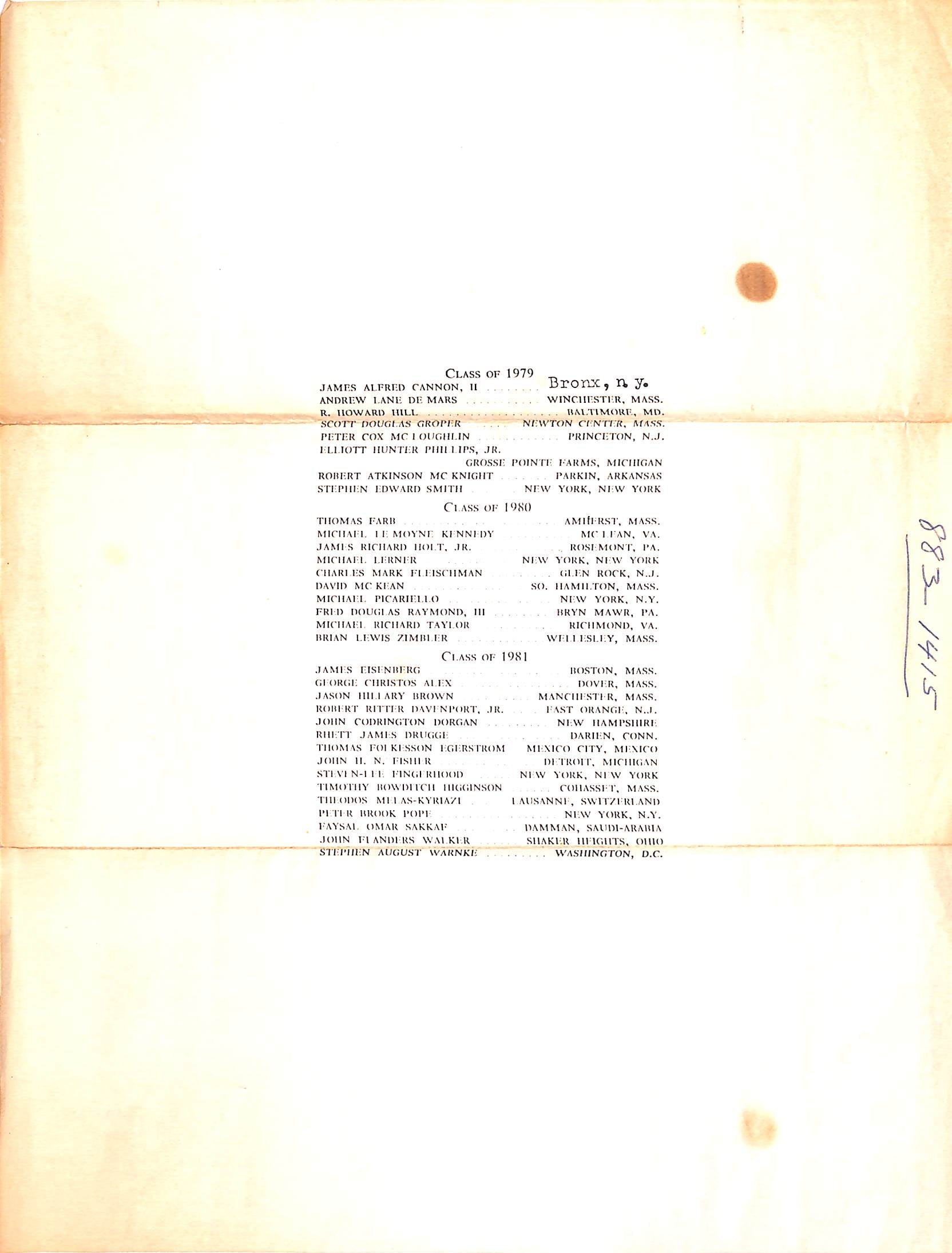 w/ 3-fold letter of Class of 1979/ 80/ 81 members