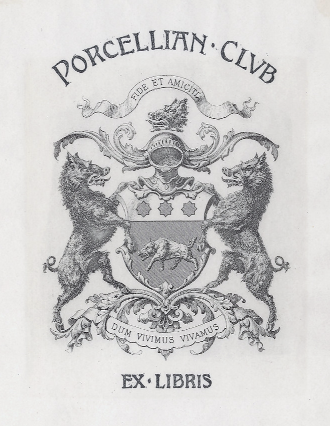 Rare bookplate which may be a proof for the 19th century version of the piece as the plate lacks the words "ex libris" but has all the other elements of the bookplate present.
