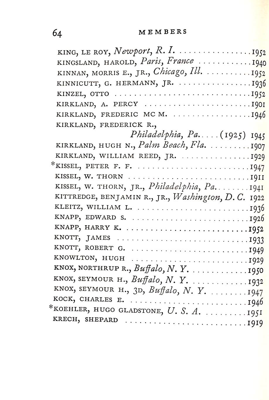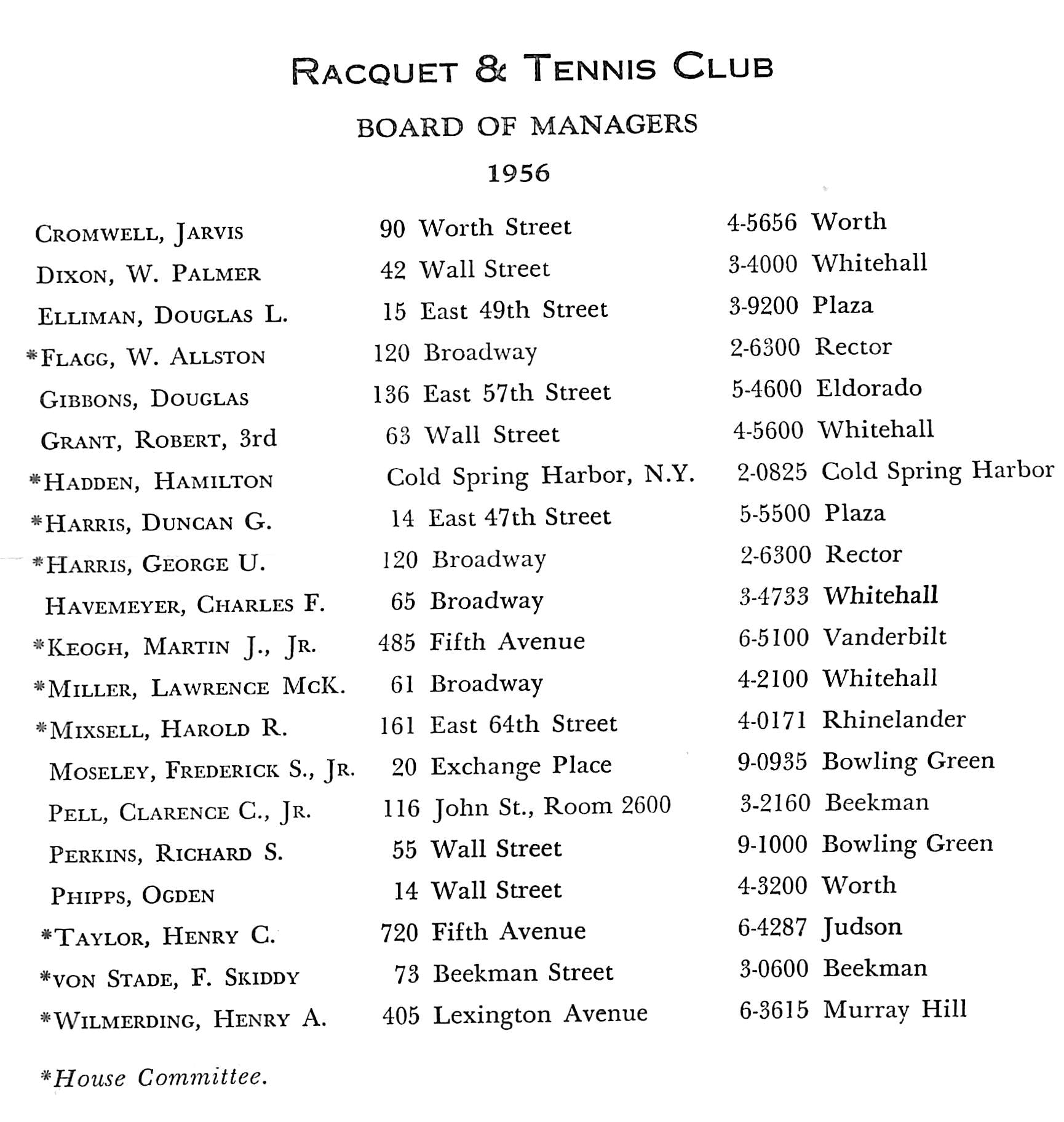 The scene of many of his triumphs was the Racquet and Tennis Club in New York, of which he was president from 1933 to 1942. He was also for many years a governor of the Piping Rock Club, Locust Valley, L. I.