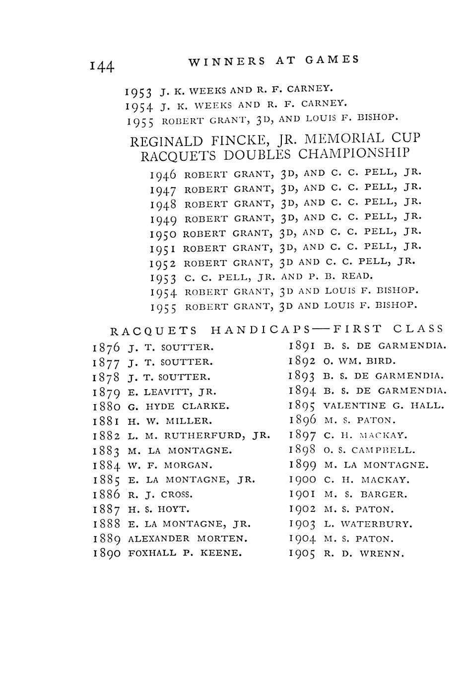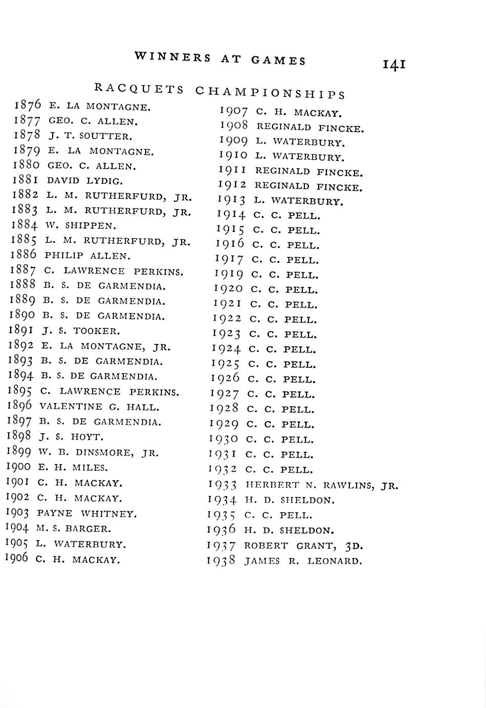 The war interrupted his record as a perennial racquets champion of the United States. He held the singles title 12 times between 1915 and 1933. Paired with Stanley G. Mortimer, he won the doubles championship nine times. In 1925 he won the British singles championship, the only foreigner to have achieved this.