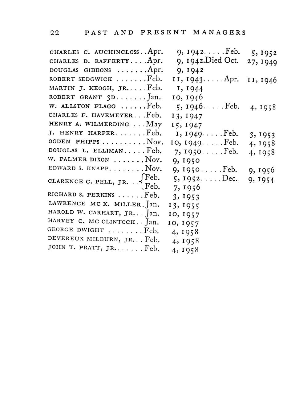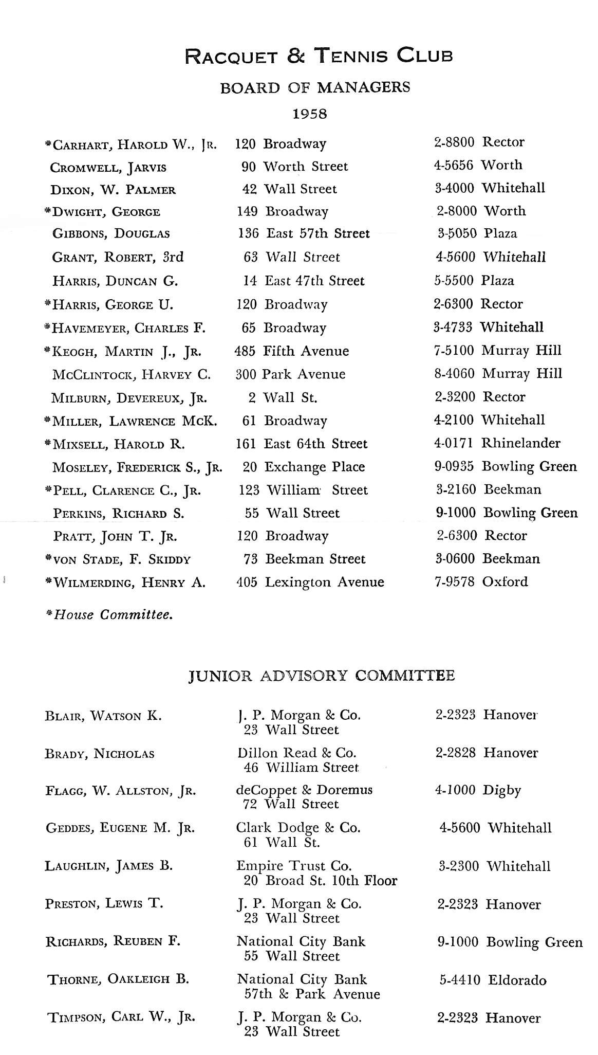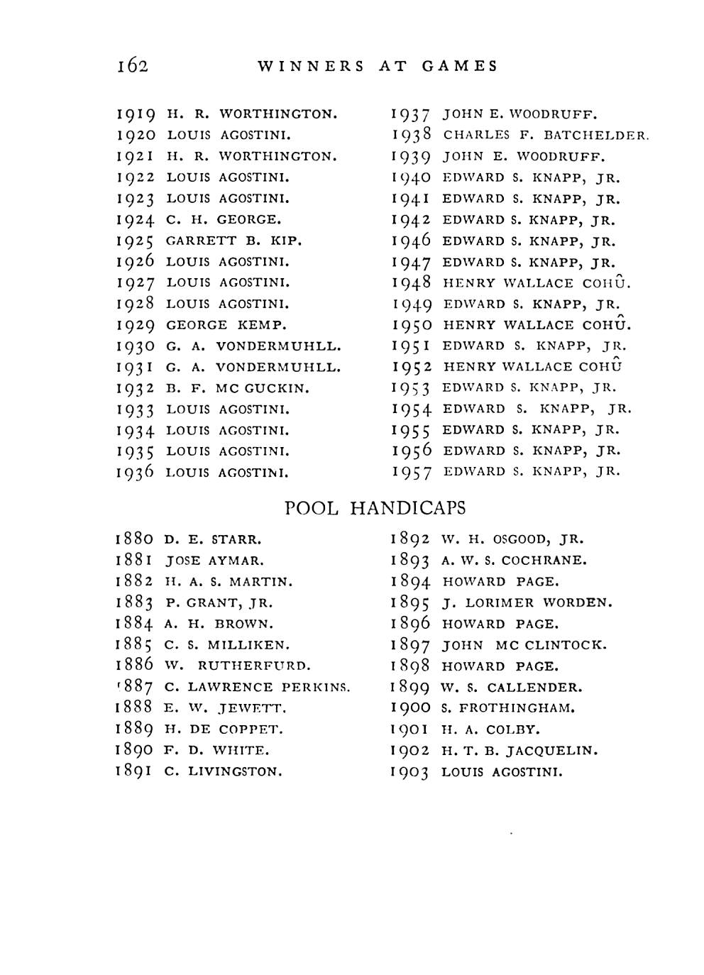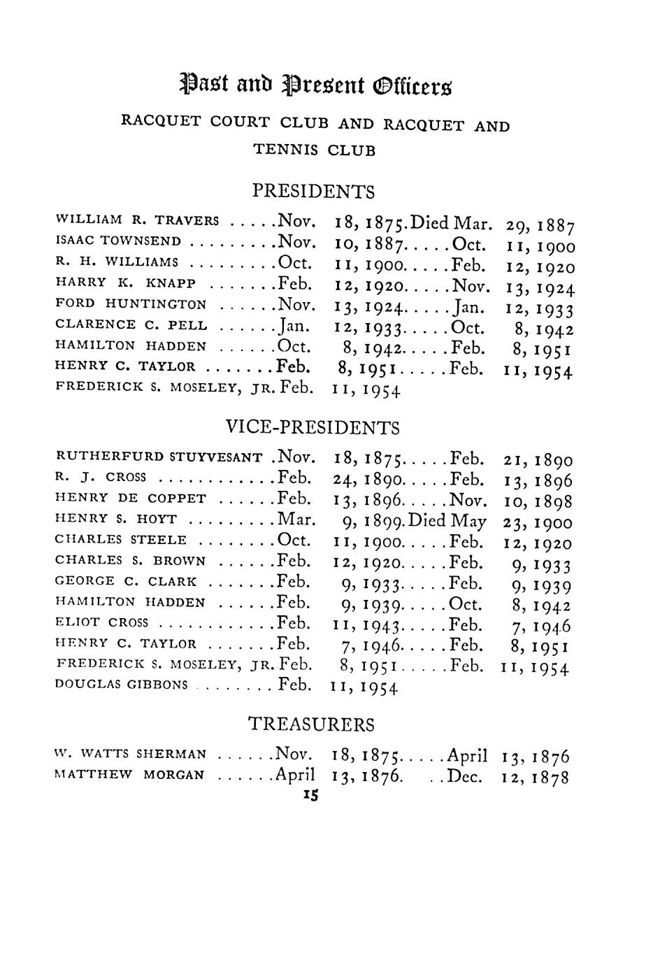 The scene of many of his triumphs was the Racquet and Tennis Club in New York, of which he was president from 1933 to 1942. He was also for many years a governor of the Piping Rock Club, Locust Valley, L. I.
