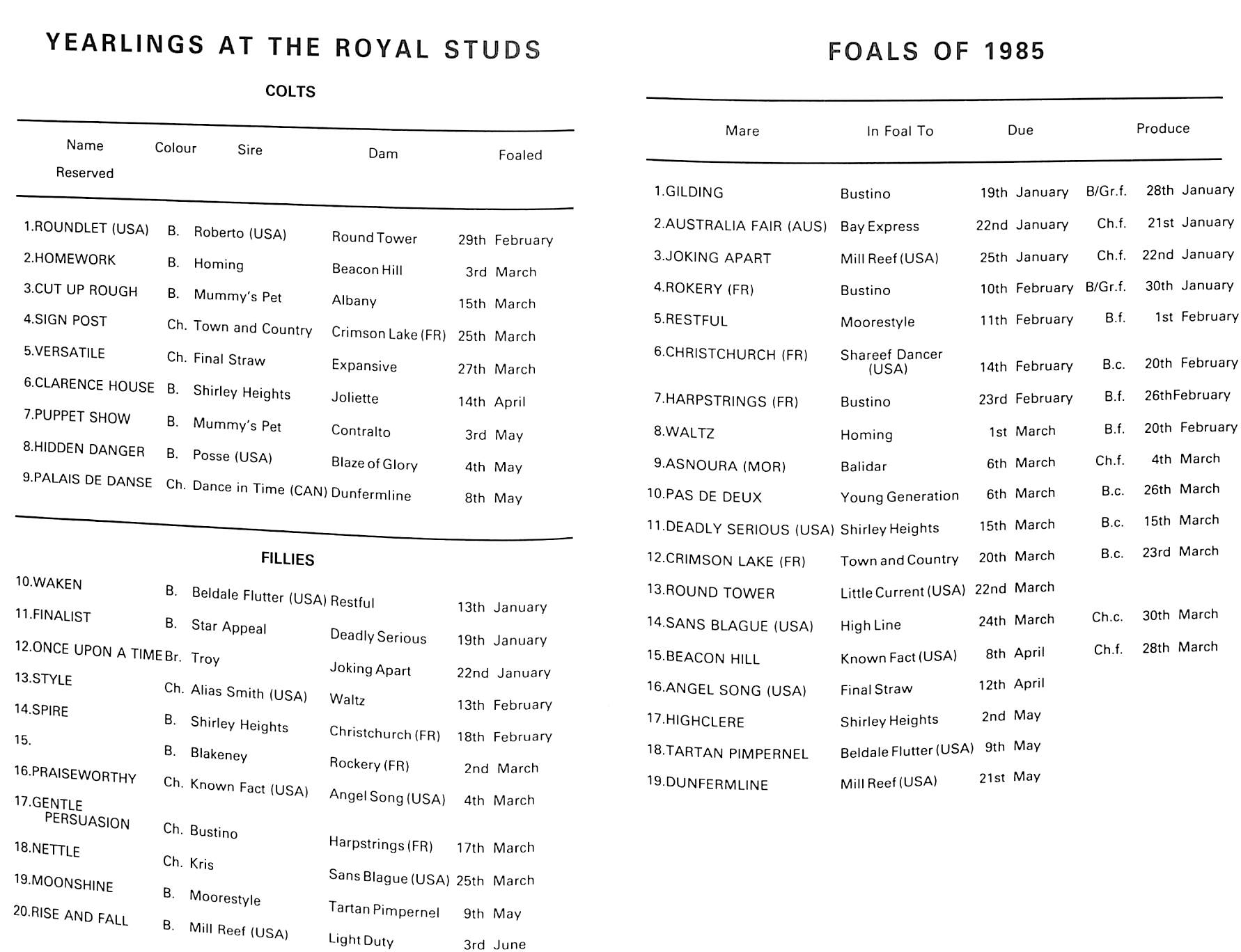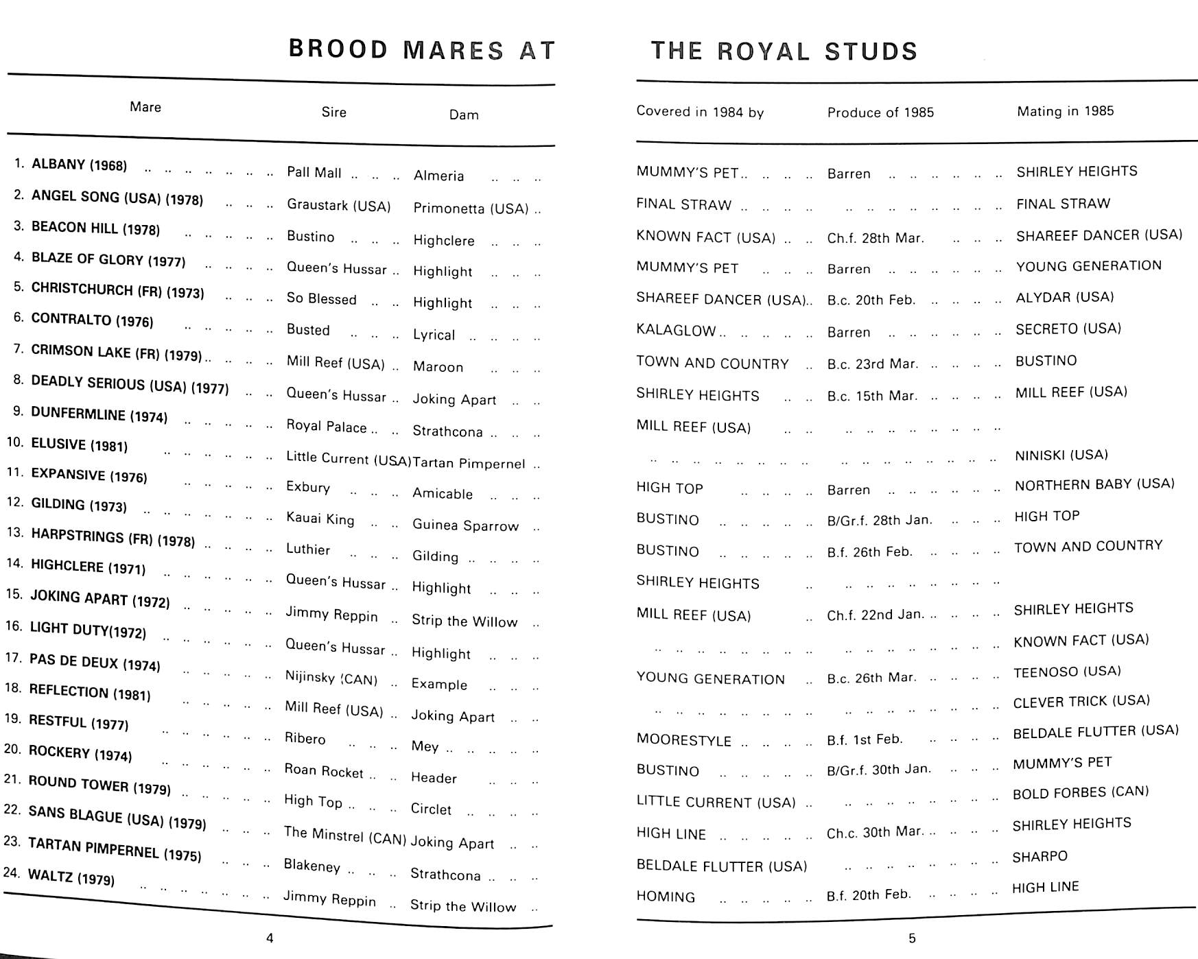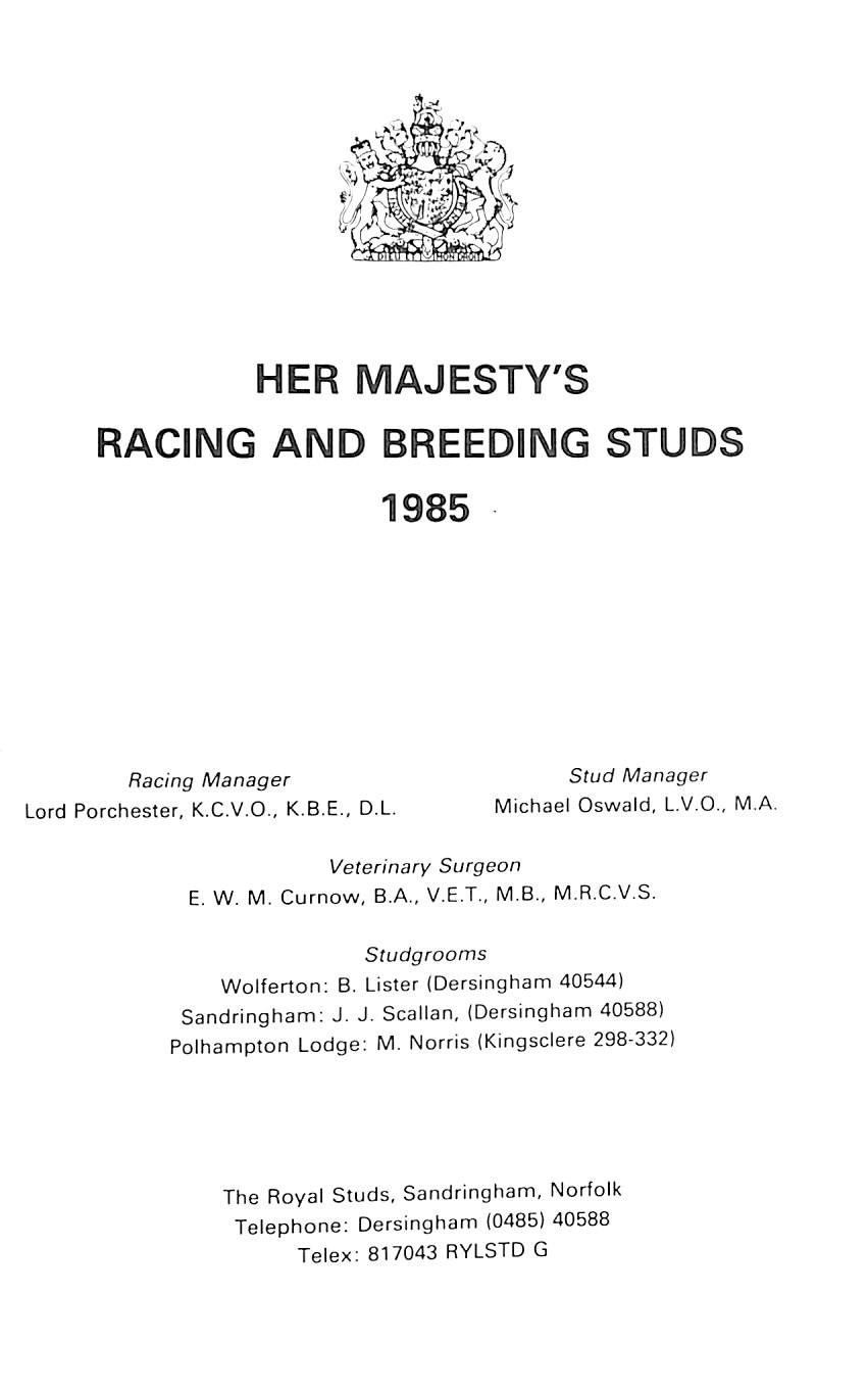 Featuring the late Her Majesty's stallions, Bustino and Shirley Heights and broodmares including Dunfermline and Highclere (with four generation pedigrees). Horses in training with Major Dick Hern and Ian Balding are listed along with yearlings and foals.