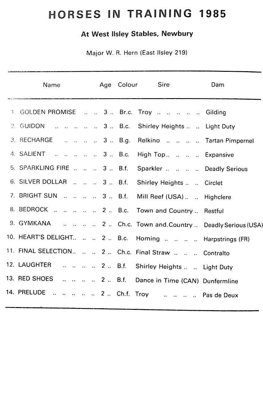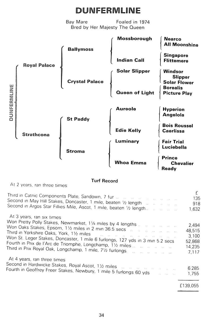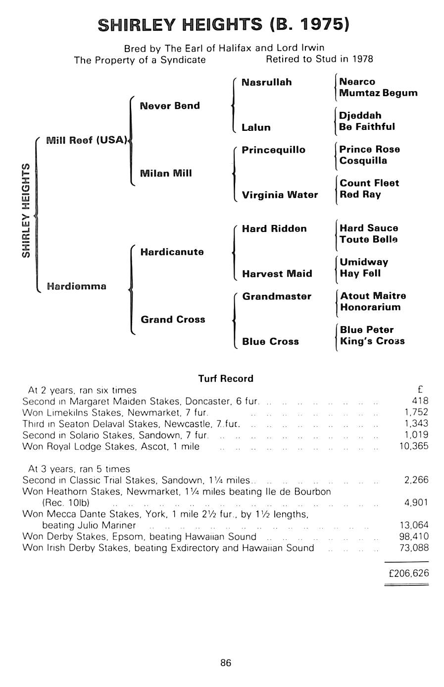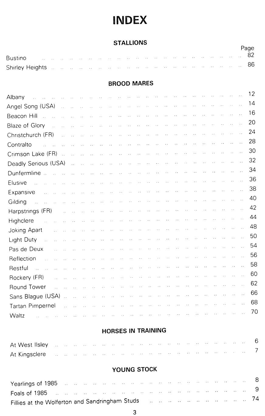 Featuring the late Her Majesty's stallions, Bustino and Shirley Heights and broodmares including Dunfermline and Highclere (with four generation pedigrees). Horses in training with Major Dick Hern and Ian Balding are listed along with yearlings and foals.