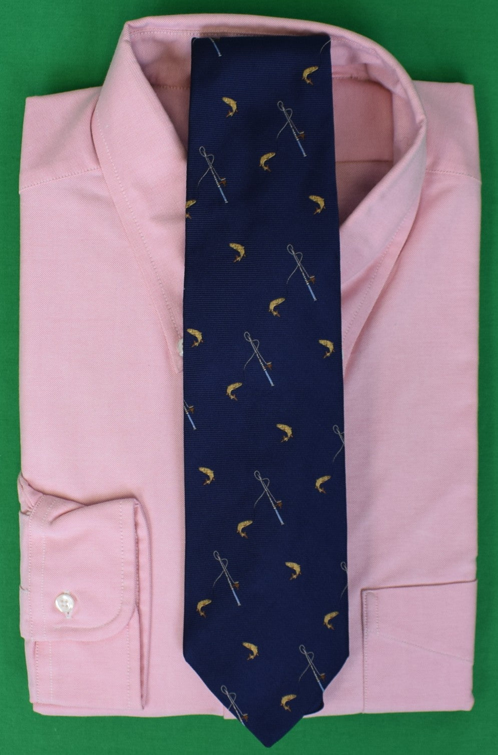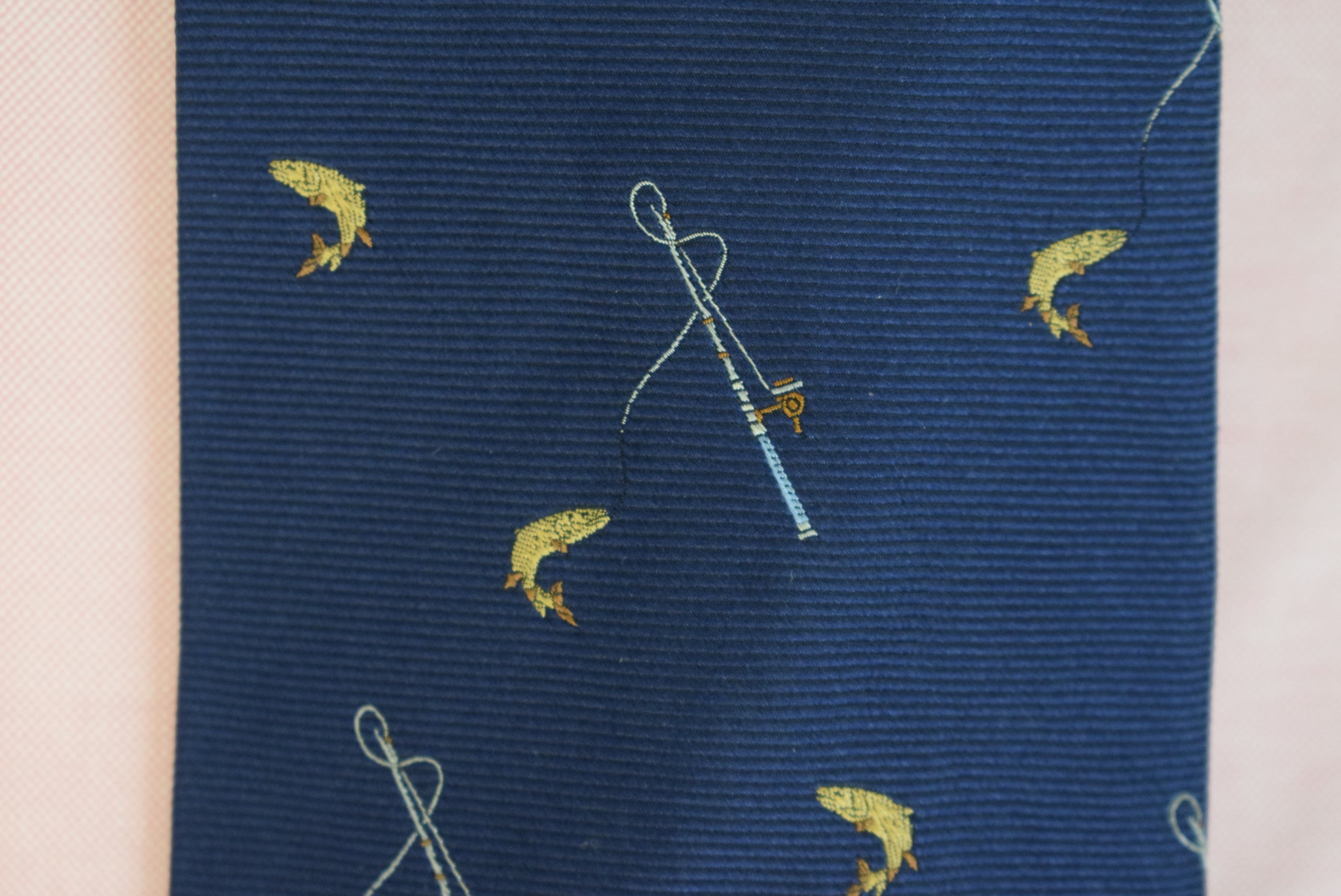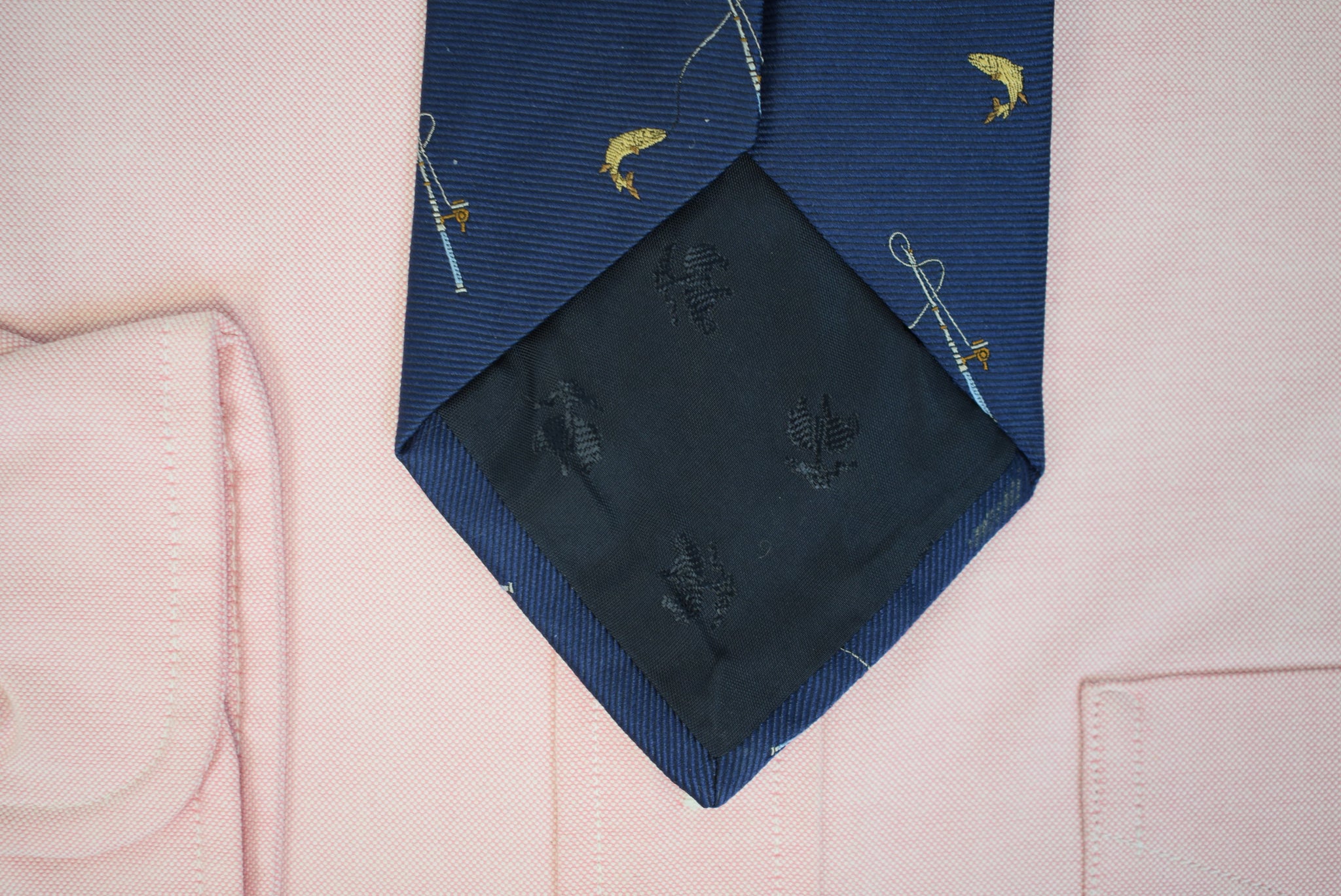 Brooks Brothers Navy Silk Club Tie w/ Leaping Trout & Fly Rod/ Reel Motif