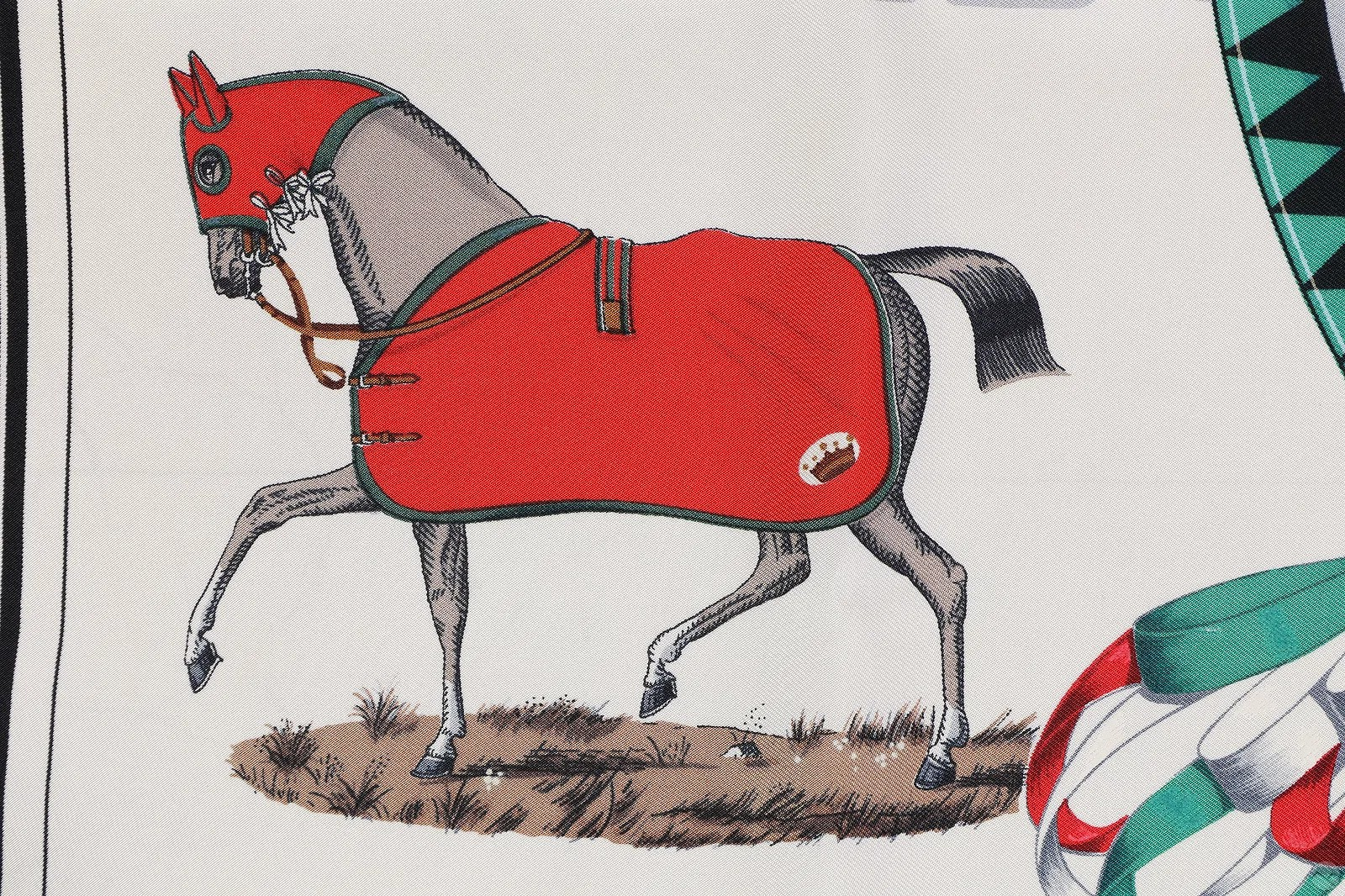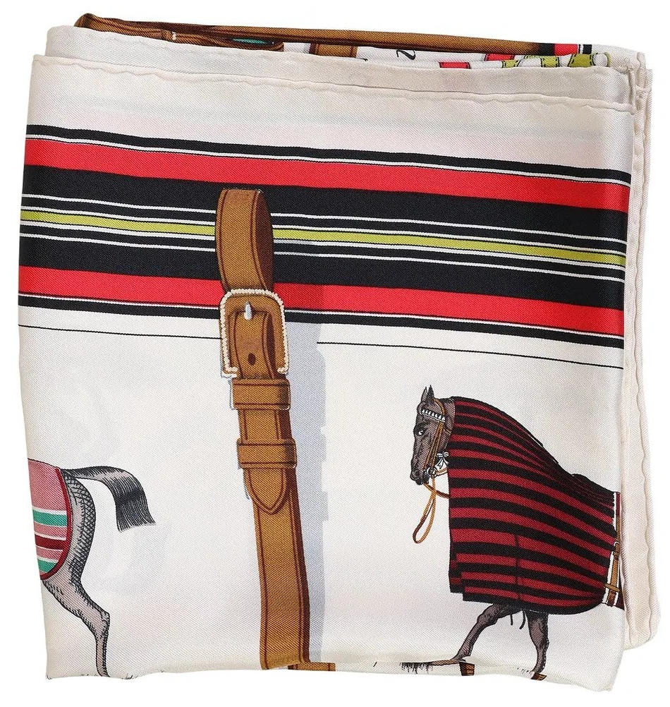 This iconic scarf is an essential part of the history of Hermès, whose primary inspiration has always been horses. It offers us a wonderful glimpse of equestrian style. Elegantly framed by leather bridles, ten horses in step are being fitted as each requires a special outfit. Each fitting depends on their schedule, stable or presentation. Whether you prefer a classic "French-style", "American-style", "net-style" blanket, or chain mail cover, Jacques Eudel's colorful strokes are so realistic and precise that it's hard to choose.
