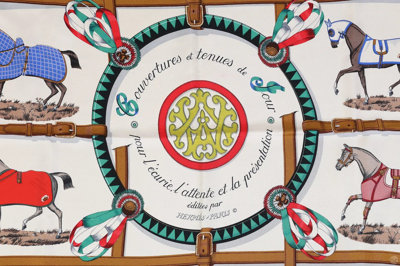 Hermes "Couvertures et Tenues de Jour" silk scarf designed by Jacques Eudel, featuring a hand-rolled hem and a colorful parade of horses in various day coverings and presentation tack. The equestrian motif is framed by gold stirrup straps and bordered in stripes of red, black, and lime green. The artist's name appears at the rim, with "Hermes Paris" at the center medallion