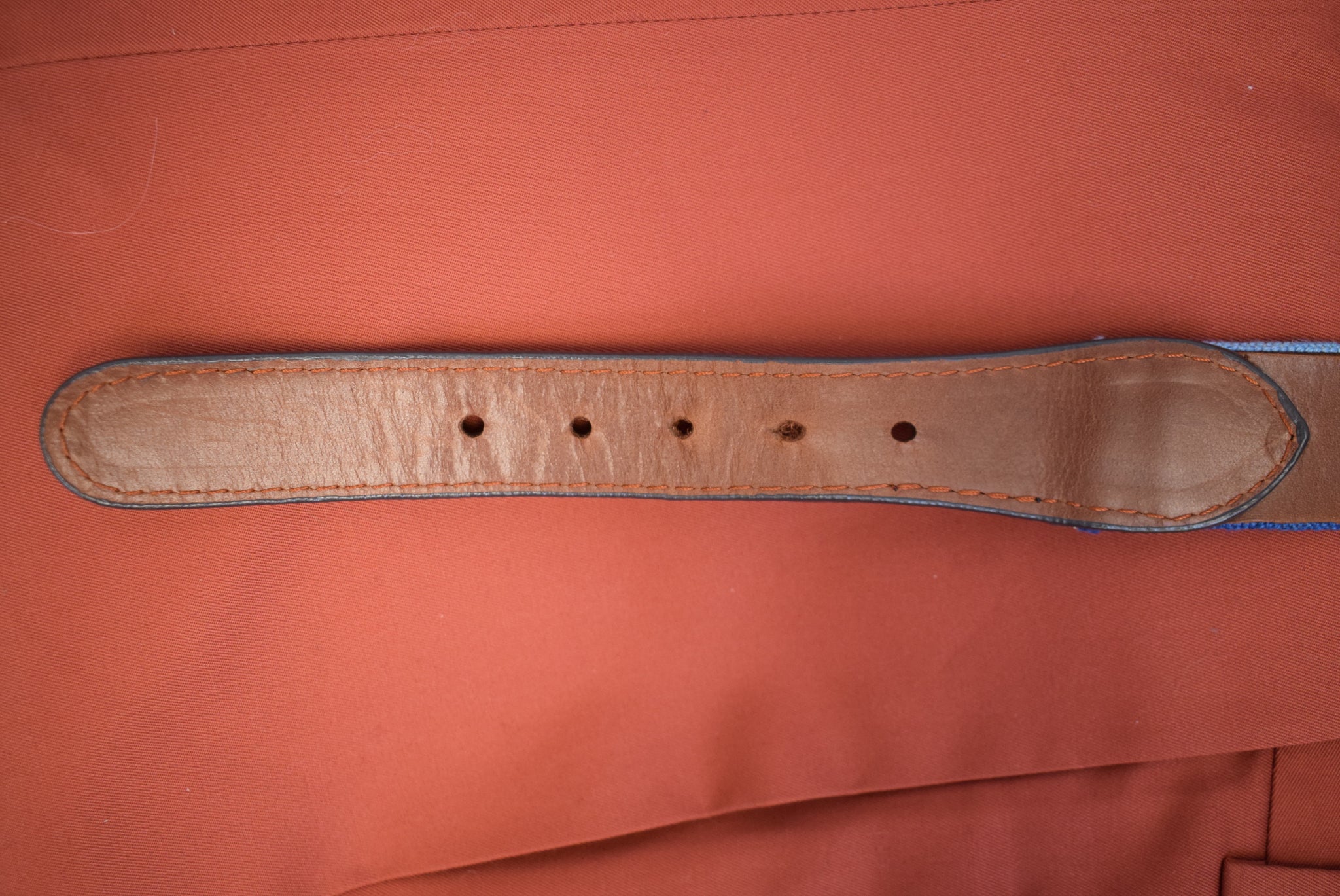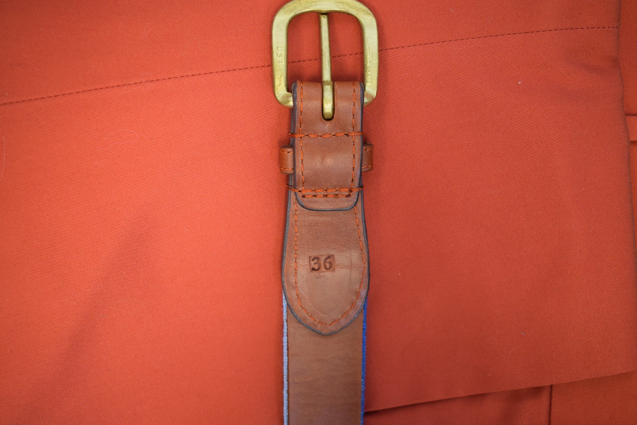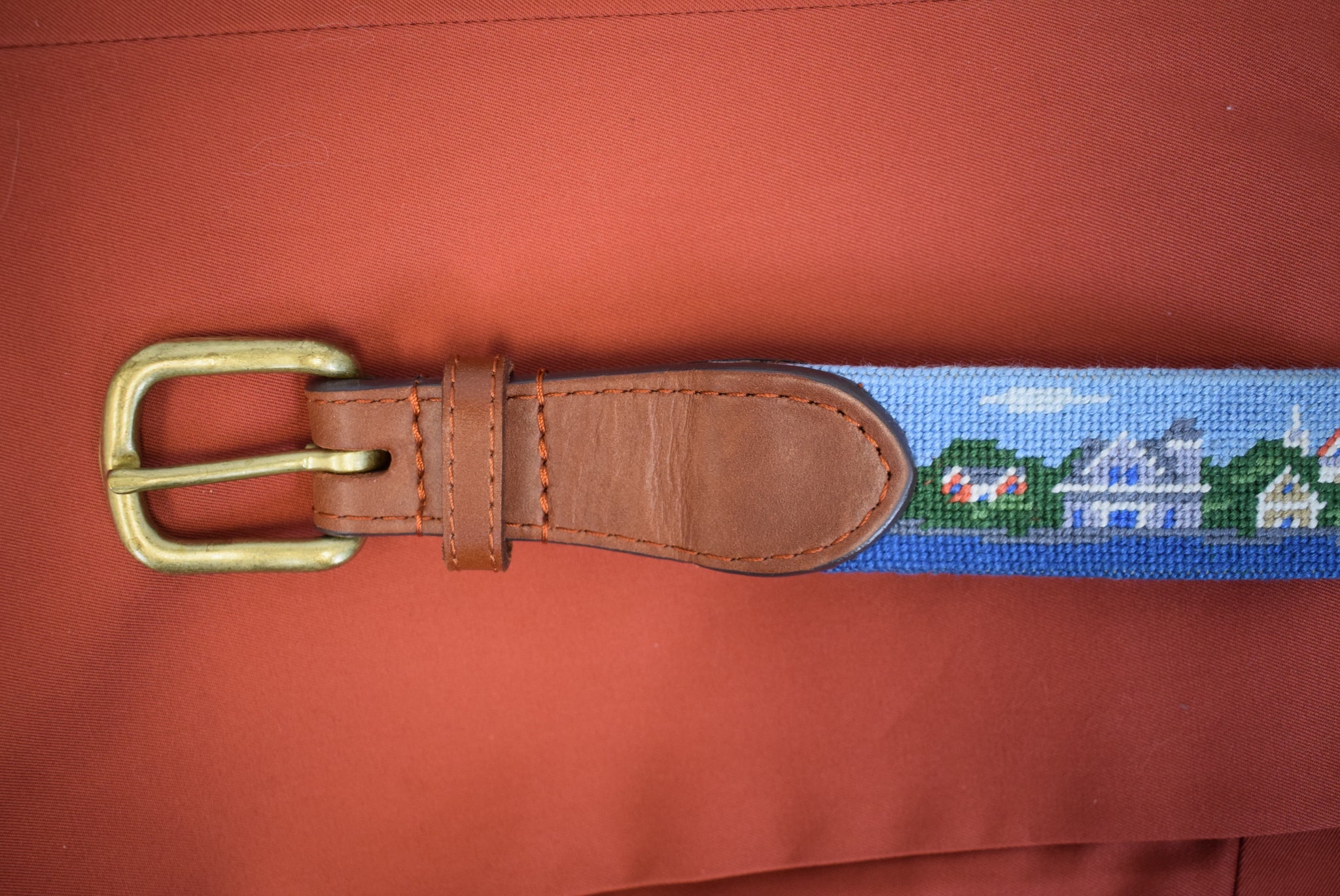 The Smathers & Branson needlepoint belt is as elegant as it is casual and fun. An exclusive design, only available from Michael Hayes 204 Bellevue Ave Newport, the Newport Belt features the iconic Newport Bridge and summer sailboats cruising the harbor. Multi-colored stitching. This hand-stitched traditional belt is 1 1/4″ in width and is finished with full grain, vegetable tanned Italian leather and a solid brass buckle.