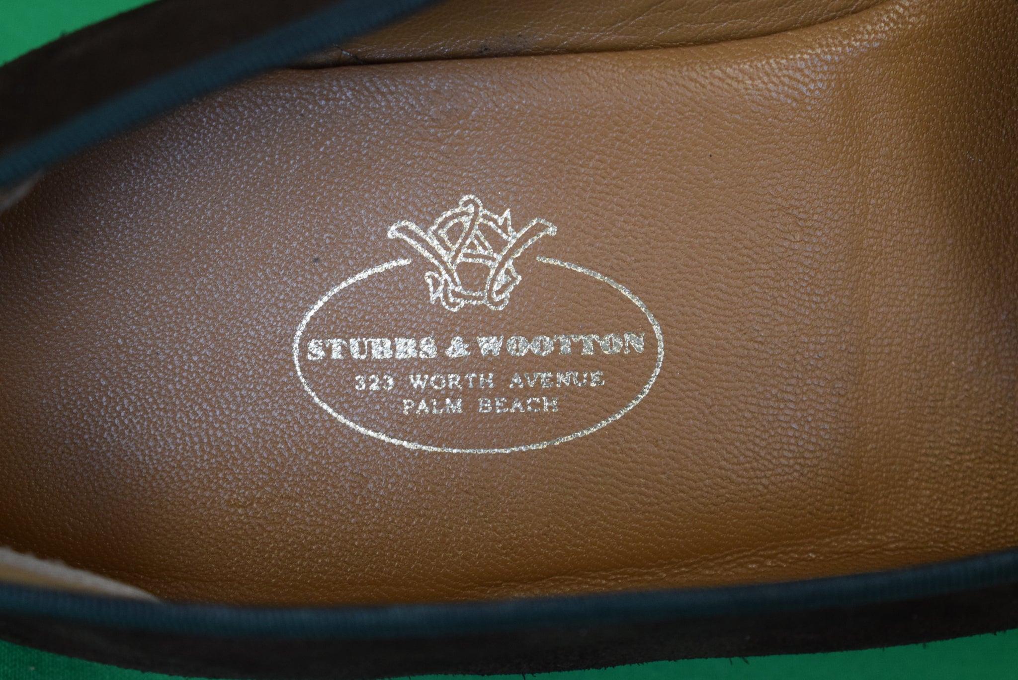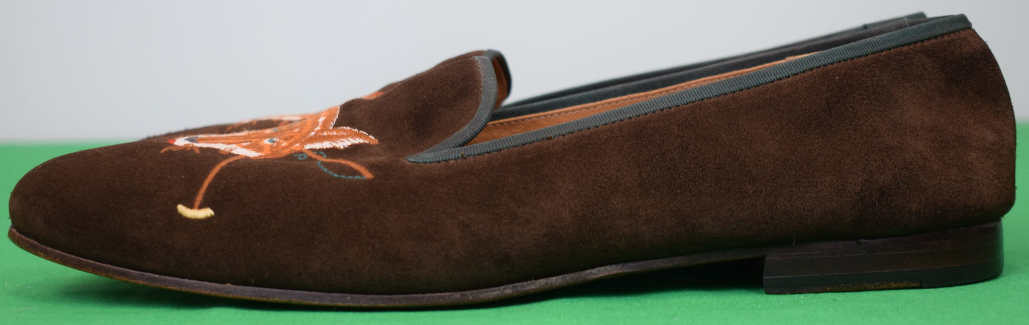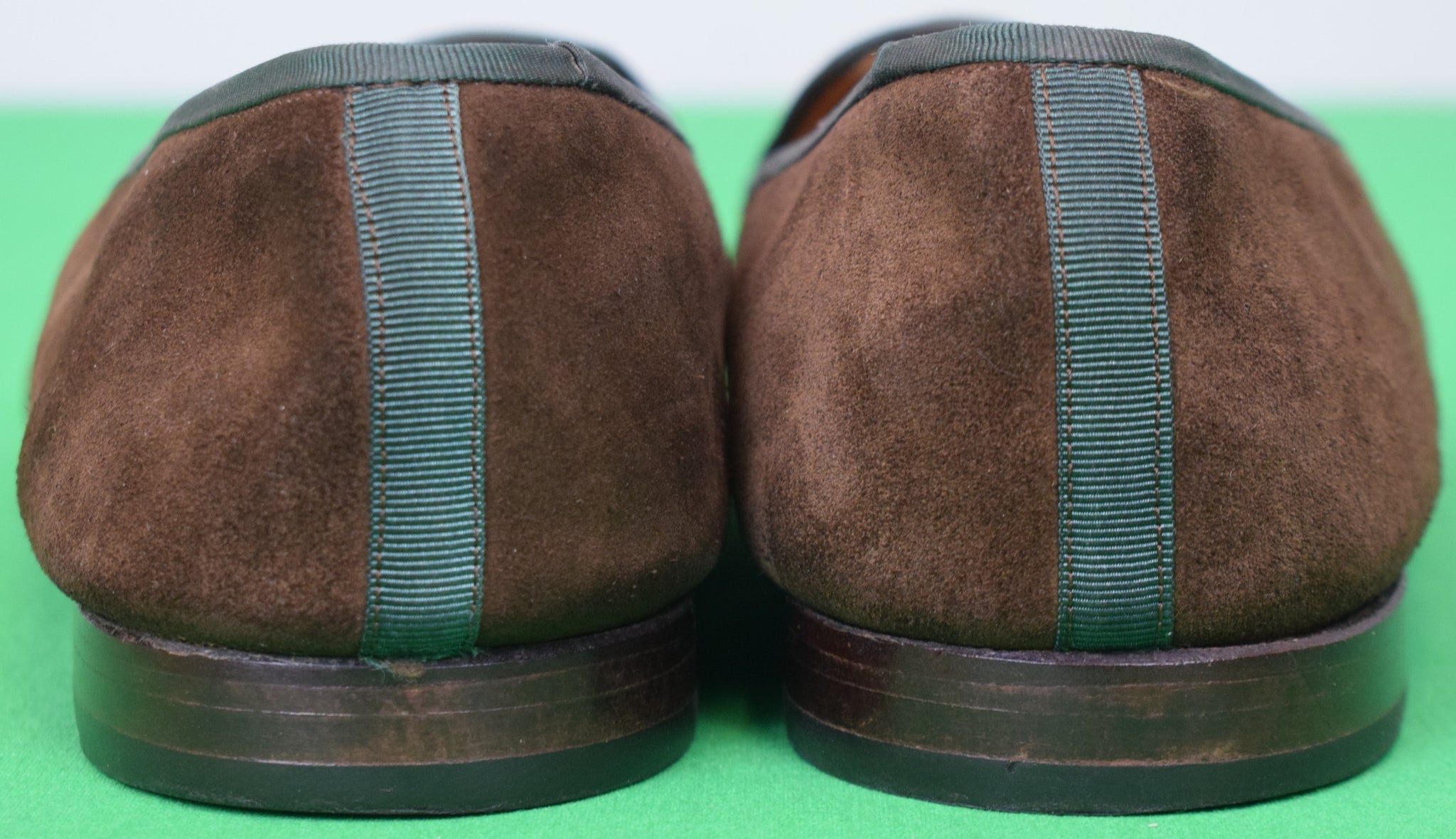 Made with split suede espresso leather, w/ hunter green silk cotton grosgrain