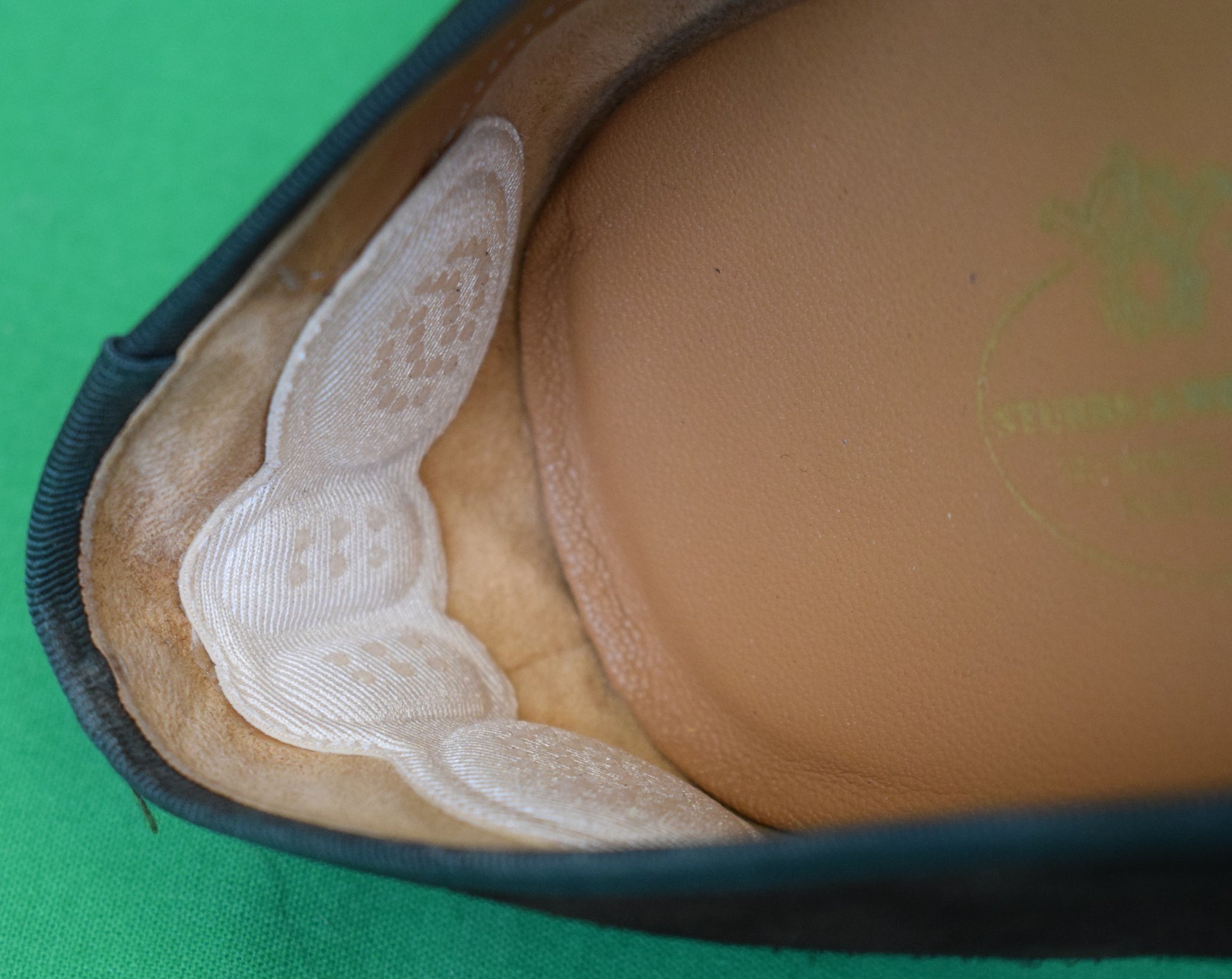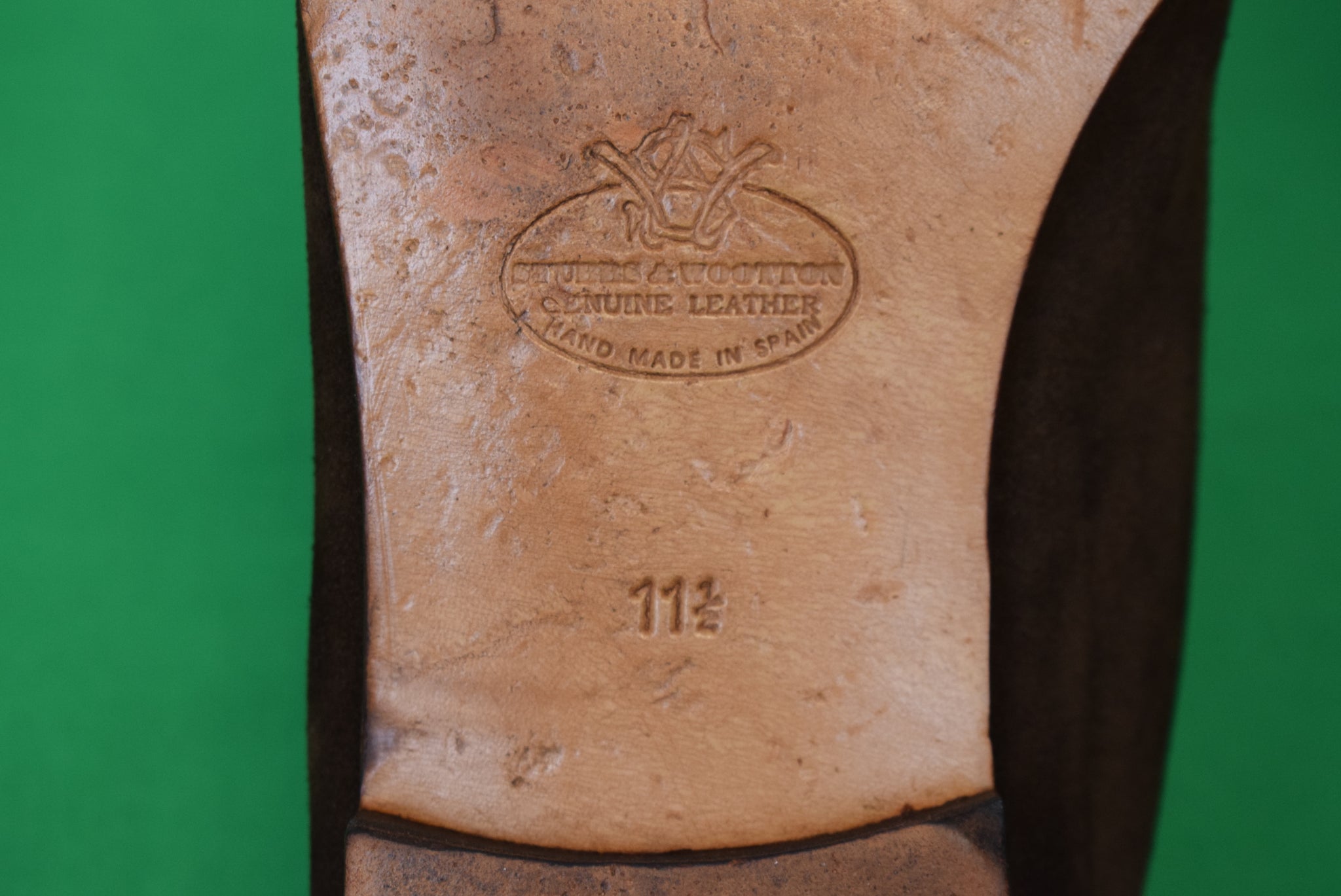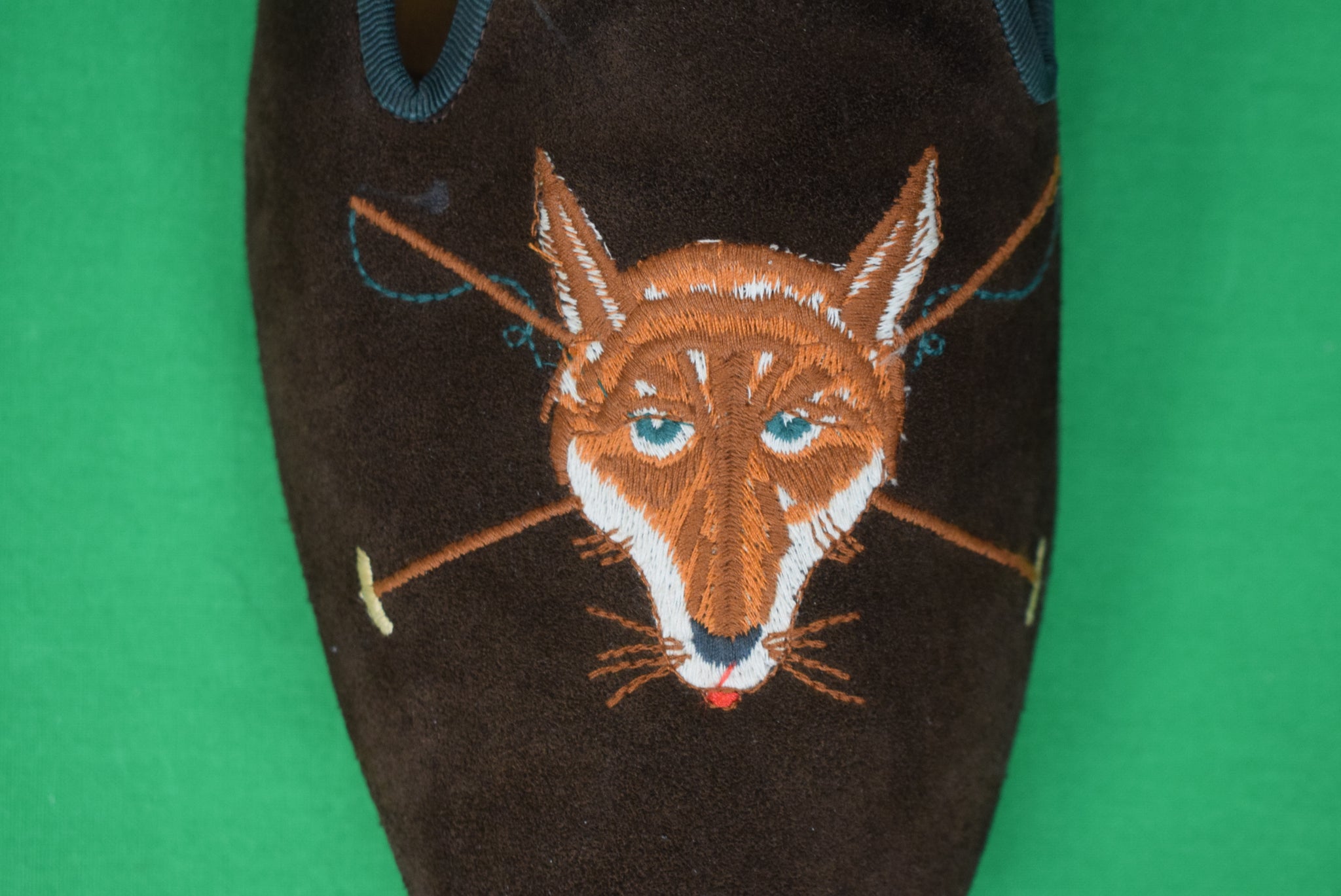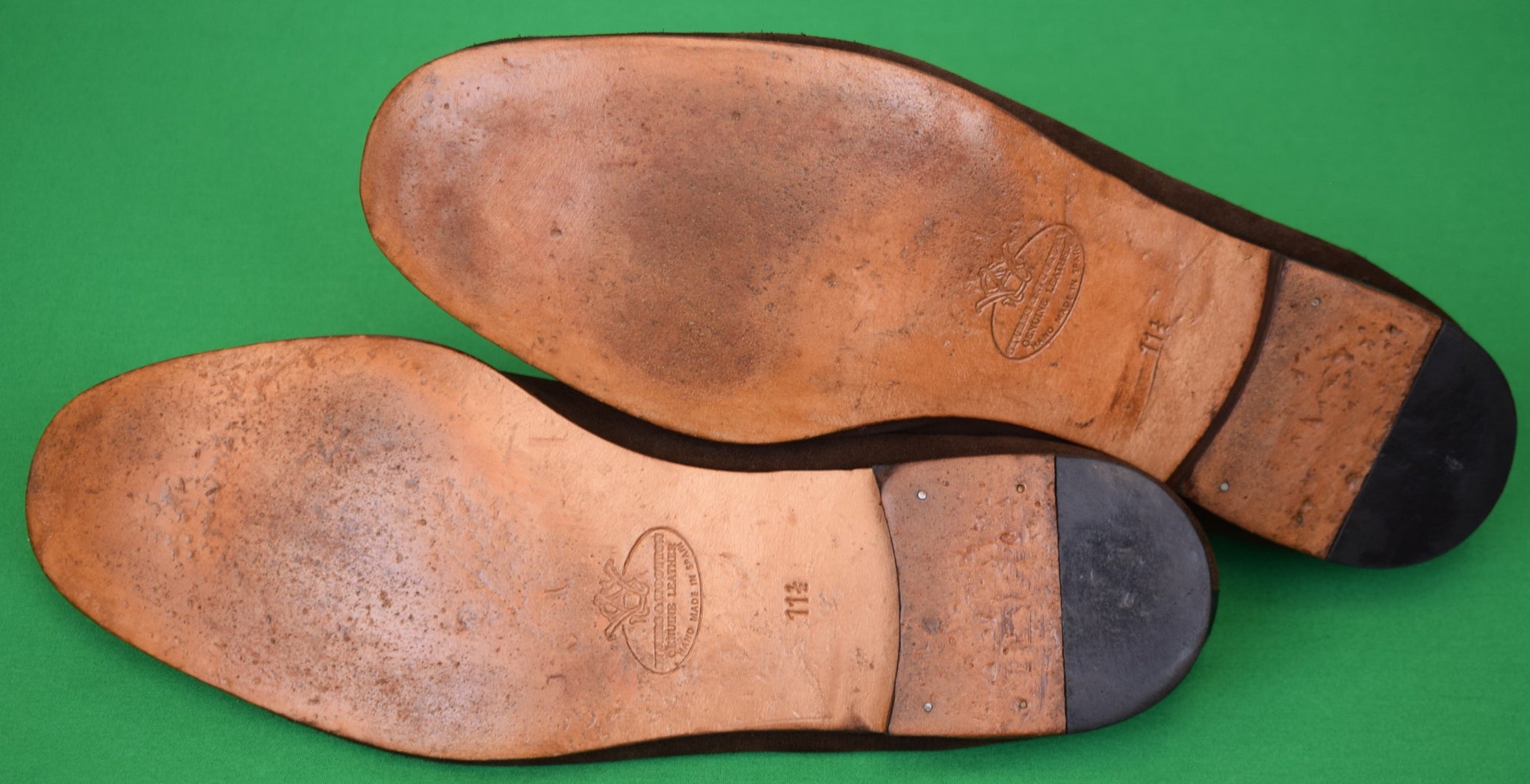Made with split suede espresso leather, w/ hunter green silk cotton grosgrain