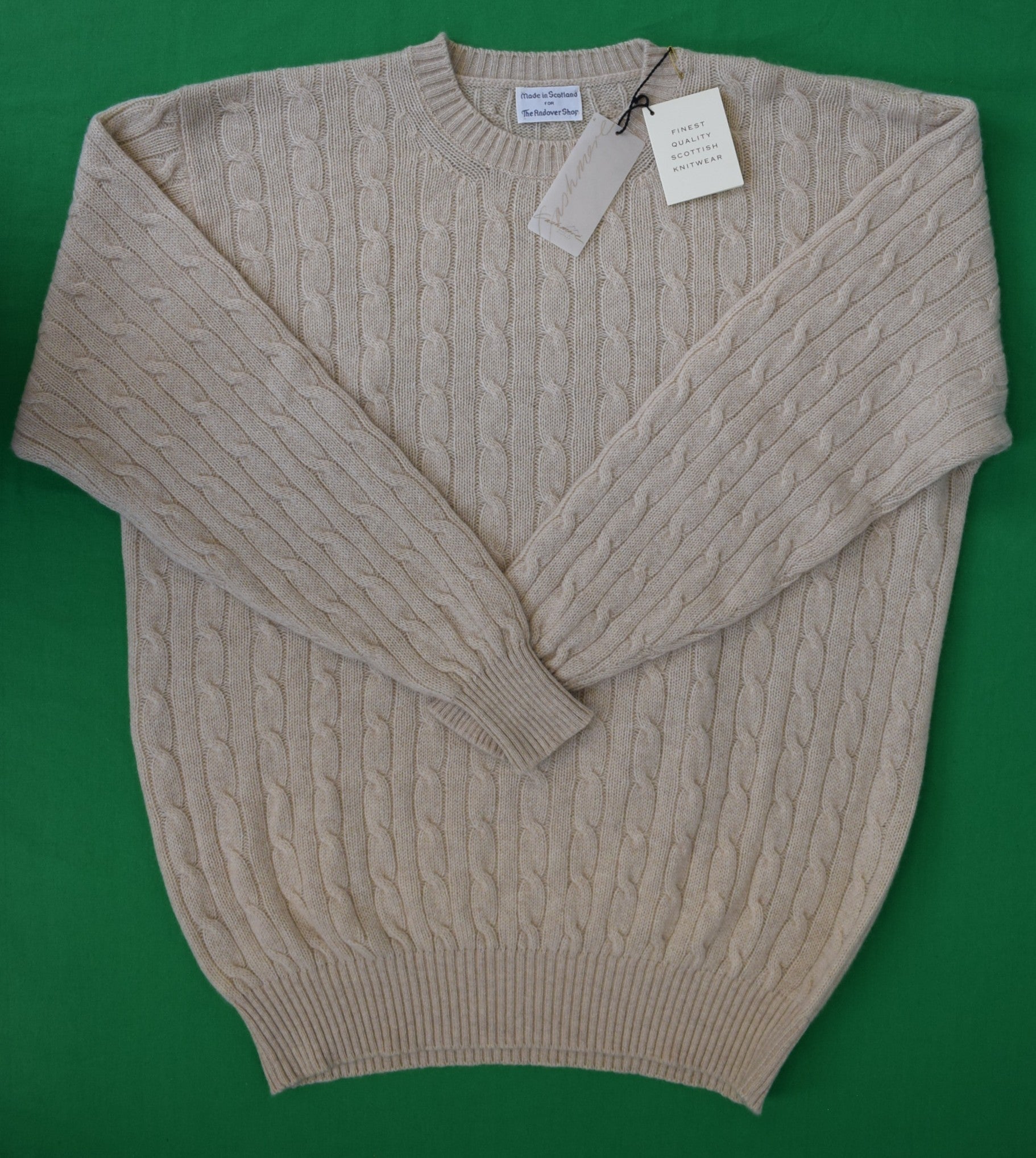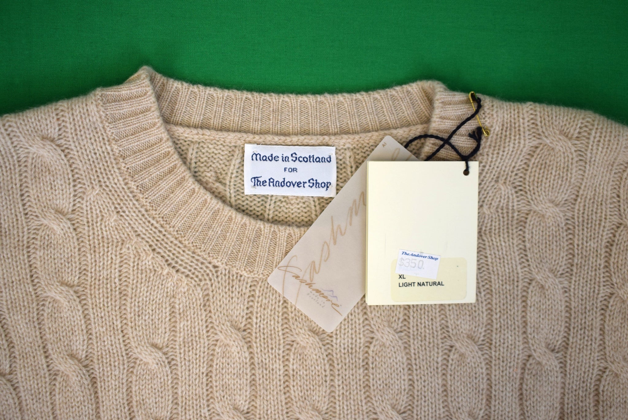 These 100% cashmere cable knit sweaters are made in Scotland for The Andover Shop from the finest cashmere. Medium weight and incredibly warm, these cashmere sweaters are perfect for a brisk fall evening and are even great well into winter. 2-ply cashmere pullover, round neck, and saddle shoulder.