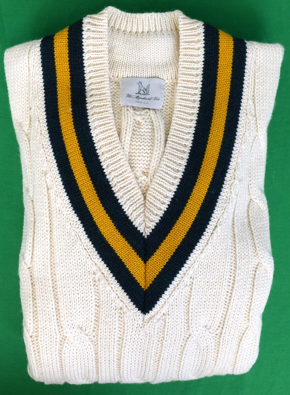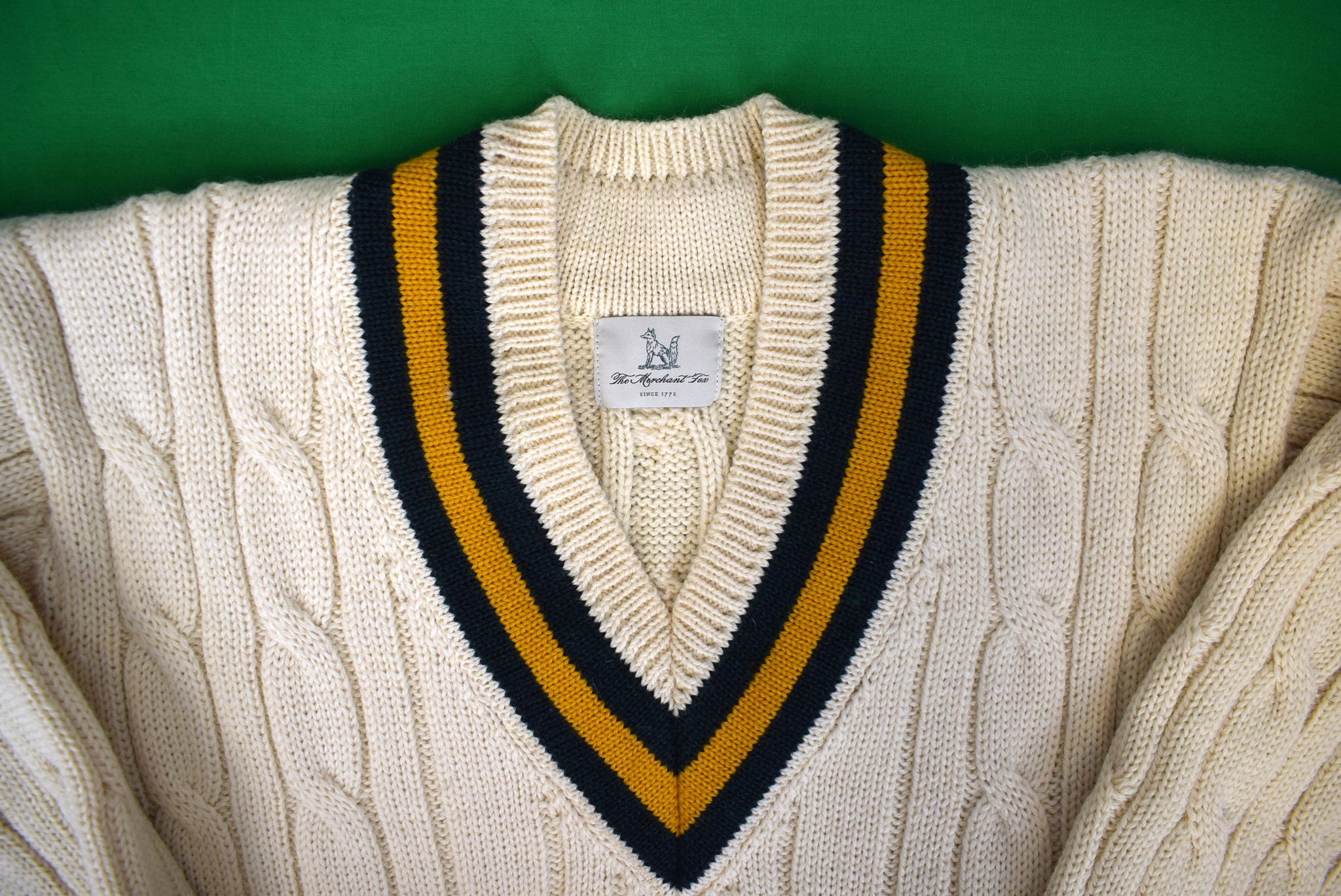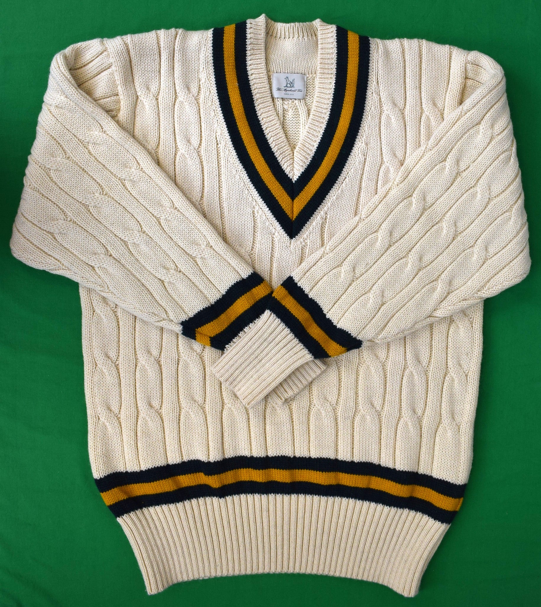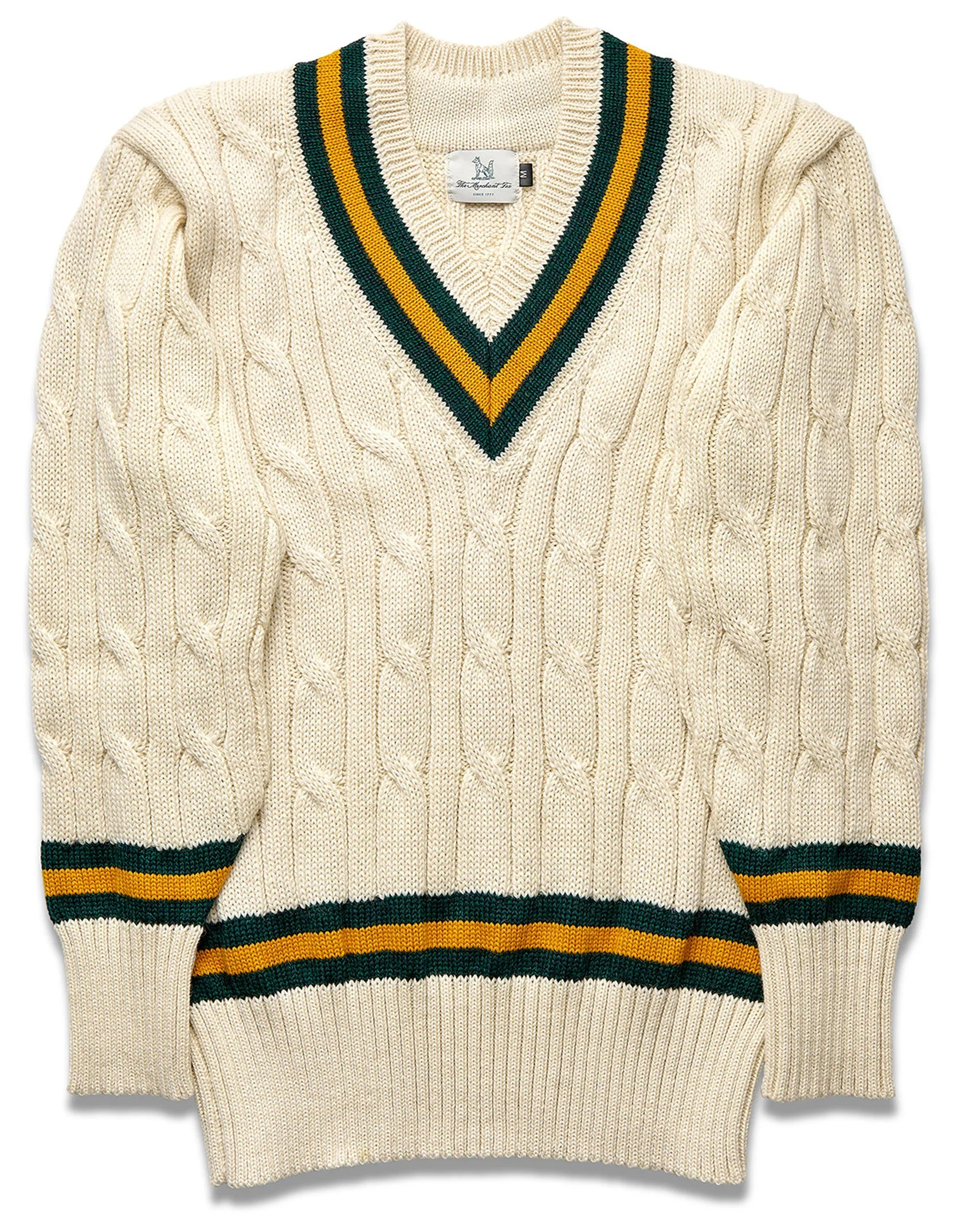 This traditionally styled cricket sweater, retains the conventional woven cable-stitch structure, along with its instantly recognisable sporting style.