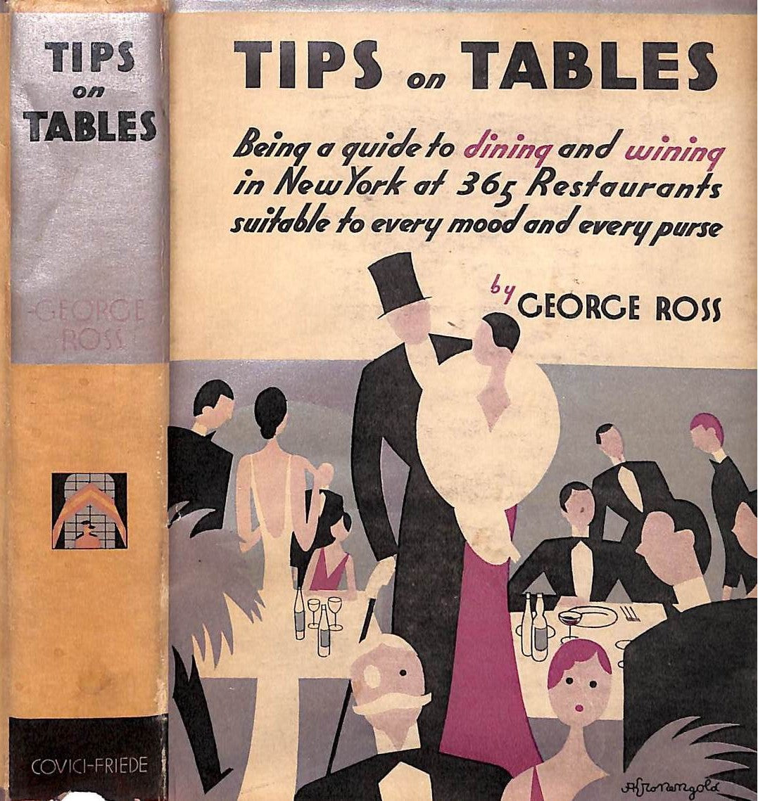 George Ross' 1930s guide to the restaurants of Manhattan. The directory includes an entry for every day of the year, noting address, price range, the maitre d' or proprietor, and a small précis of the establishment. The book was published just following the end of prohibition making it an essential guide for locals, as well as tourists. There are sections 'For two young things very much in love', 'How to drown that hour between curtain fall and night club time', and 'To soothe the savage beast'. Copies with the silvery art deco dust jacket are scarce.