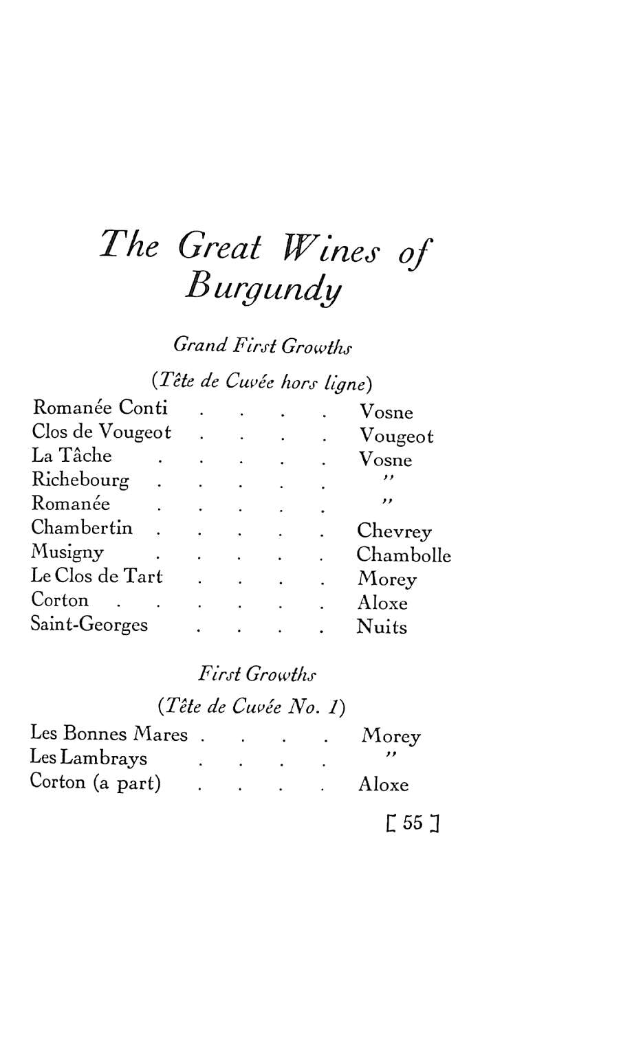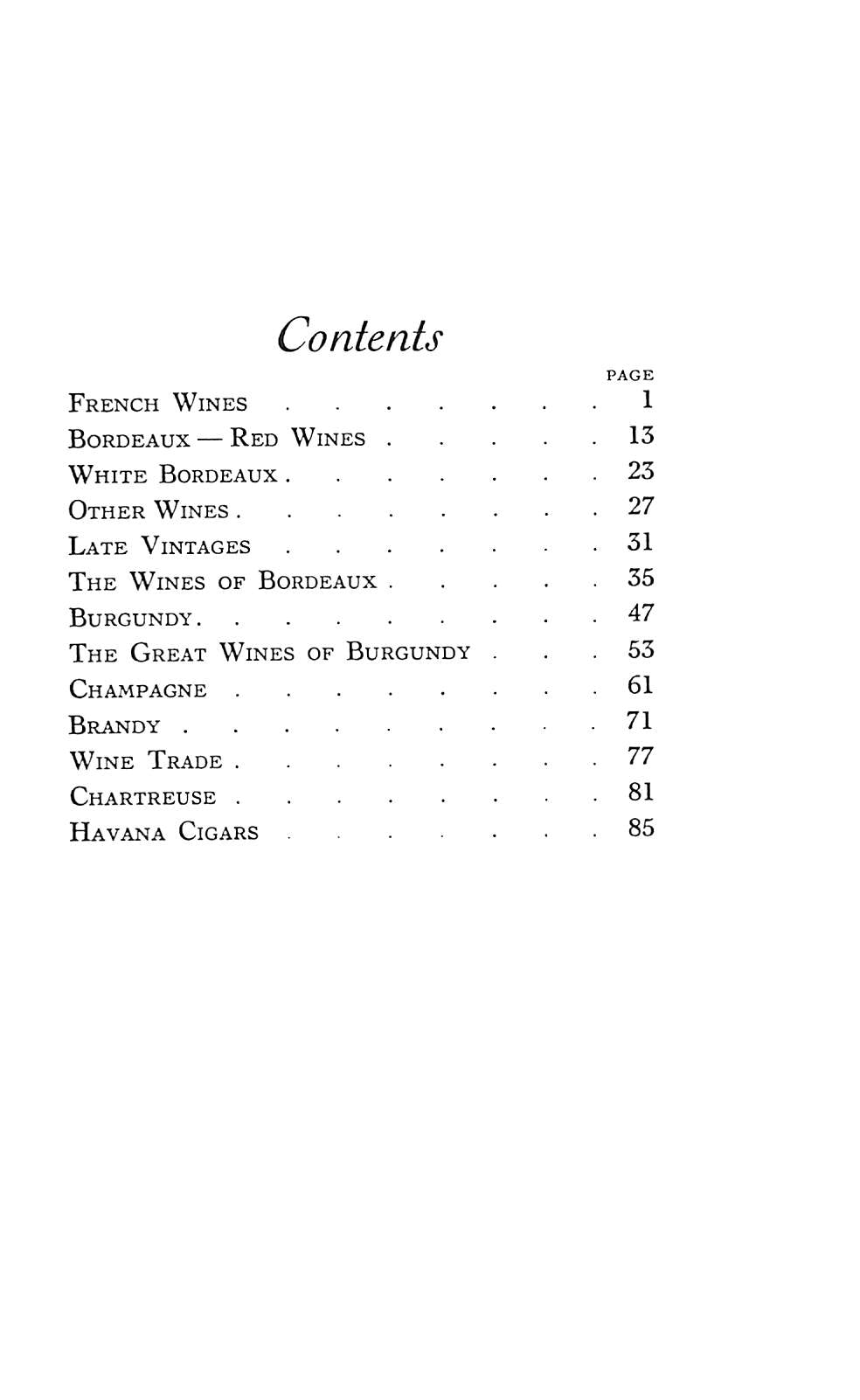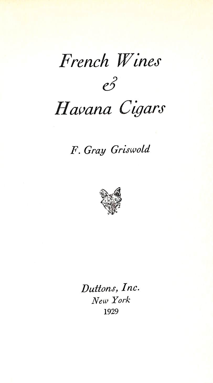 One of 300 copies, printed by the Plimpton Press, Norwood, Mass. Quarter velum with gray papered sides; spine and front cover gilt stamped. Endpapers illustrated with map of France and Corsica, showing regions of the principal vineyards and significant wine markets. Frontispiece photograph of ''Les Rois des Grands Crus Girondins'' (six leading Bordeaux winegrowers, including baron Robert Rothschild (Chateau Lafite), et al.) pp. 101. A guide to fine French wines, with lists of the vineyards of high regard in Bordeaux and Burgundy, along with incidental chapters on Chartreuse and brandy, concluding with a 14-page chapter on Havana cigars. Frank Gray Griswold (1854-1937) was an American financier, bon vivant, sportsman, writer, and prominent figure in New York society. In 1929, Griswold published this and a companion book, Old Medeiras. Both volumes were dedicated to the ''The Kittens,'' an aristocratic dinner club, limited to twenty members, which had been established in 1869 in New York City. Their dinners featured many of the fine wines and vintage madeiras discussed in the two volumes. Griswold joined the club in February 1891 and wrote a history of the club, privately published in 1916.
